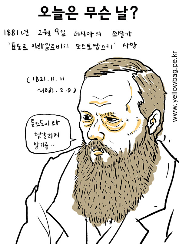 1881년 2월 9일 러시아의 소설가 '표도르 미하일로비치 도스토옙스키'가 죽은 날이다. 그는 러시아 문학의 최고 거장 중의 한 명이며 20세기 소설에 큰 영향을 미쳤다. 그의 대표작으로는 <죄와 벌> <카라마조프의 형제들>이 있다. 그의 소설은 인간 심리에 대한 놀라운 이해 역을 보여주고 러시아의 정치, 사회, 정신세계 등을 날카롭게 분석했다. 그를 실존주의의 창시자로 말하기도 한다. 그는 평생 동안 돈에 쪼들렸으며, 항상 출판사로부터 먼저 돈을 받고 글을 썼기 때문에, 돈을 갚기 위해서는 쉬지 않고 글을 써야 했다고 한다. 그의 작품의 원동력은 돈 이였다는 그런 말도 있다.