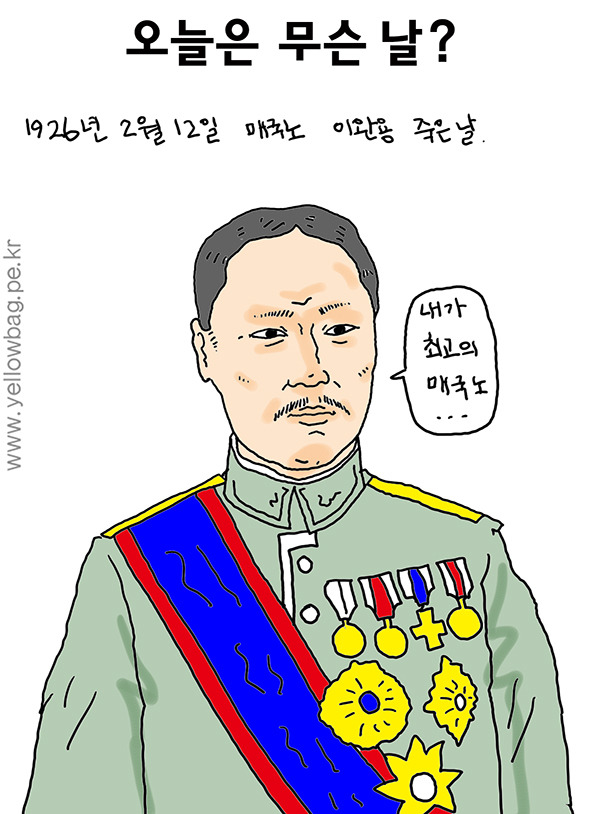 1926년 2월 12일 대한제국의 정치가, 친일파, 매국노의 대표 이완용이 죽은 날이다.그는 1905년 러일 전쟁에 일본의 승리가 결정되자, 친일파로 변신해 어전회의에서 고종을 협박해 을사늑약을 맺게 했다. 그 대가로 조선귀족 백작 작위, 내각총리대신, 조선총독부 중추원 부의장, 조선사 편수회 고문 등을 지냈다. 1909년 12월 22일에 이재명이 칼로 암살하려 했으나 실패했다. 이완용은 칼에 왼쪽 폐가 관통했지만, 일본인 의사가 최신 의료기술을 총동원해 약 2개월 동안 치료해 살려내었다. 그러나 폐병을 얻어 계속 고생하였다. 그 후도 이완용은 조선에서 왕 다음 부자라는 소문까지 나며 재산을 늘려가며 잘 살다가 69세 장수하다 죽었다.
