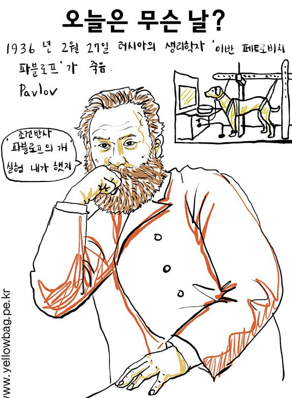 1936년 2월 27일 러시아의 생리학자 '이반 페트로비치 파블로프'가 죽은 날이다. 그는 동물 해부와 수술, 실험을 통해서 소화액 분비 연구를 하였는데, 음식을 입에 넣으면 침을 흘리던 개(무조건 반사)가 먹이 주는 사람의 발소리만 들려도 침을 흘리게 되는(조건반사) 실험 '파블로프의 개'라는 실험으로 유명해졌다. 그는 소화액 분비에 관한 연구로 1904년 노벨 생리. 의학상을 받았다. 그러나 동물실험 중 전기자극과 해부 등으로 동물학대에 대한 비판이 늘 그를 따랐다.-------------------------------------------------------------------------지금도 실험실에서는 흰색 쥐 나, 원숭이, 돼지 등을 가지고 수많은 실험들이 행해지고 있다. 그 덕분에 인간의 수명은 길어지고, 기술은 발전하고 있다. 잔인하지만 어쩔 수 없다. 그러나 일본은 그 동물실험에서 더 나아가 같은 인간을 실험재료로 써서 수많은 생체실험을 하였다. 인간의 잔인함은 어디까지 일까?