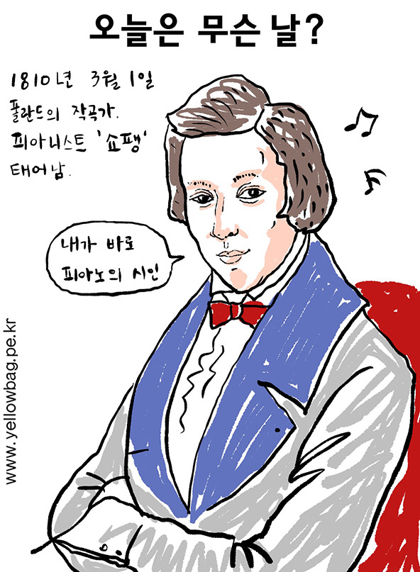 1810년 3월 1일 폴란드의 작곡가,피아니스트 프레데리크 프랑수아 쇼팽이 태어났다.쇼팽은 '피아노의 시인'이라는 별칭을 가지고 있고 가장 위대한 피아노곡 작곡가 중의 한사람이다. 그는 6살에 피아노를 배우고 8살때 공연을 가졌다. 그의 천재성은 모짜르트에 비견될 정도였다. 쇼팽은 수많은 피아노 곡을 작곡했는데 21개의 녹턴,58개의 마주르카등 많은 곡들이 있다.그의 작품은 다른 작곡가에게 큰 영향을 끼쳤다.쇼팽을 기리기 위해 1972년에 시작되어 1955년 부터 5년에 한번씩 열리는 쇼팽 국제 피아노 콩쿠르 대회가 있는 이는 차이코프스키 콩쿨, 퀸 엘리자베스 콩쿨과 더불어 세계3대 콩쿨로 불리며 우승하면 온 세계에 이름을 알리게 된다. 2015년 우리나라의 조성진이 1위를 하여 이름을 떨쳤다.