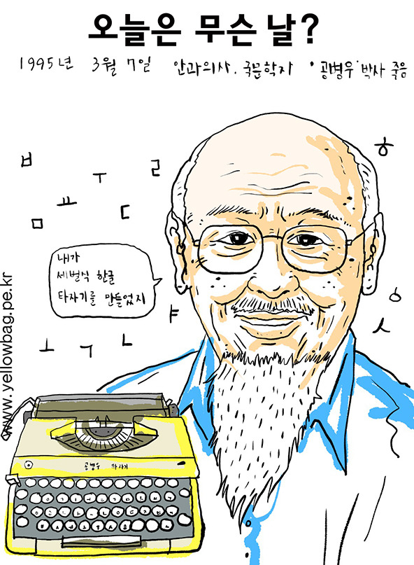 1995년 3월 7일 한국의 안과의사, 한국어학자 공병우 박사가 죽은 날이다. 그는 1938년 한국인 최초 안과 전문 병원 공안과를 개원한 의학박사였고, 해방 이후부터는 한글 기계화 운동에 주력하여 한글 세벌식 글자판 개발과 보급에 힘썼다. 1949년에는 최초로 개량형 기계식 타자기를 개발했다. 그러나 박정희 정부 때 네 벌식 글자판이 표준으로 되었고, 전두환 정부 때는 컴퓨터에 두벌식 자판이 표준이 되어 그의 세벌식 자판의 꿈은 이루어지지 못했다. 그는 한글학회 이사장을 지냈고 한글문화원을 개설하고 원장을 지냈다. 그는 90대 고령의 나이에도 한글문화원에서 젊은 프로그래머였던 강태진, 정내 권이찬 진, 안대혁 등과 교류하였고, 이 인연으로 디들은 훗날 한글과 컴퓨터를 창업했으며 국산 워드프로세서인 아래아한글을 개발하게 되었다.----------------------------한 사람의 집념으로 우리는 디지털 시대에도 우리의 한글을 좀 더 편하게 쓸 수 있게 되었다.