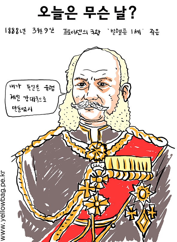 1888년 3월 9일 프로이센의 국왕 겸 독일의 제2제국 초대 황제 빌헬름 1세 죽음. 그는 군국주의로 프로이센을 강대국으로 만들려 하였다. 그는 왕이 되자 철혈 재상으로 유명한 비스마르크를 수상으로 등용해 독일을 유럽 제일의 강대국으로 만들었다. 빌헬름 1세 때 비스마르크의 주장으로 군비를 확장하고 1864년 덴마크, 1866년 오스트리아, 1871년 프랑스 전쟁에서 승리하여 독일 제국을 선포하고 통일을 이룩하였다. 비스마르크는 빌헬름 1세에게는 충성을 다하였지만 국무, 의회, 외교에서 매우 독단적으로 일을 하였고 결국 반대 여론에 밀려 비스마르크를 해임해야 했다.