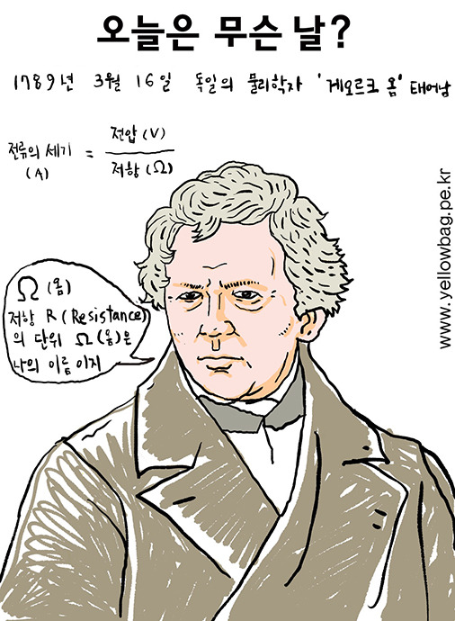 1789년 3월 16일 "옴의 법칙' 으로 잘 알려진 독일의 물리학자 '게오르크 시몸 옴' 태어났다. 전기 저항의 단위를 나타내는 '옴'은 그의 이름을 따서 만들었다. 옴의 법칙은 전압,전류,저항 사이의 관계를 설명한 법칙인데 "전류의 세기는 전압에 비례하고, 저항에 반비례 한다." 이다. 옴은 많은 실험을 한뒤 결과를 종합하여 옴의 법칙의 결론을 얻었다. 그러나 당시에는 다른 학자들에게 많은 비판을 받았다. 그러나 그 후 다른 과학자들의 정밀한 검증 실험으로 신뢰들 얻기 시작하였고, 여러실험으로 확인 되었다.