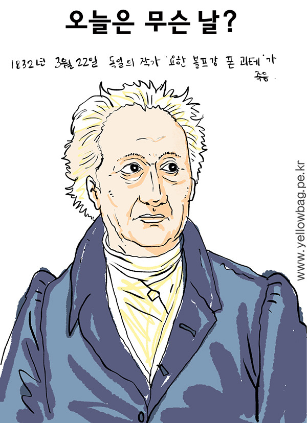 1832년 3월 22일 독일의 작가, 철학자, 과학자, 정치가 요한 볼프강 폰 괴테가 사망하였다. 그는 어려서부터 다양한 교육을 받았으며 대학에서는 법학을 공부하였다. 법률 사무소에서 일하던 중 약혼자가 있는 샤를로테 부프와 사랑에 빠지게 되는데, 이때 경험을 소설로 옮긴 것이 <젊은 베르테르의 슬픔>1774이다. 그 후 행정가와 광물학, 색채론 등 다양한 분야에 관심을 가졌고 <색 재론>, <빌헬름 마이스터의 수업시대>, <이탈리아 기행> 등을 썼다. 24살에 구상하기 시작하여 생을 마감하기 전에 완성한 <파우스트>를 완성하고 1832년 82세로 세상을 떠났다.