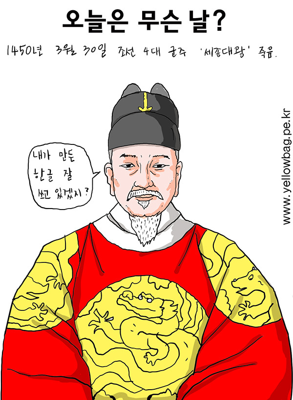 1450년 3월 30일 조선의 4대 왕 세종대왕 죽음. 그는 과학, 예술, 문화 등 많은 분야에서 뛰어난 왕이었다. 그의 업적 중의 최고는 1443년 누구나 쉽게 배울 수 있는 효율적이고 과학적인 문자 인 훈민정음을 창제한 것이다. 과학분야에서는 혼천의, 자격루, 측우기 발명을 후원하였고, 국방에서는 압록강과 두만강 유역으로 국경을 확장하였고, 왜구를 토벌하여 대마도를 정벌하였다. 그는 대식가에 몸집이 비대하였다는 기록도 있는데, 몸이 좋지 않아 각종 질병을 다스리기 위하여 자주 온천에 행차하였고, 당뇨병 합병증과 중풍 등의 후유증으로 54세를 일기로 승하하였다.