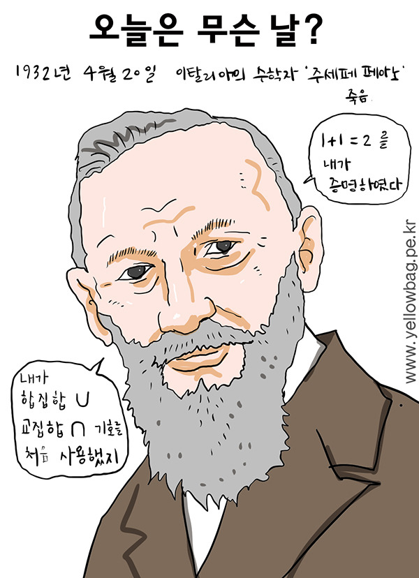 1932년 4월 20일 이탈리아의 수학자이자 철학자 주세페 페아노가 73세로 죽음. 그는 대학교에서 미적분학 과목을 가르쳤고 수리논리학에 대한 책을 출판하였다. 이 책에서 합집합(U) 기호와 교집합 기호에 대한 현대적 기호가 최초로 등장하였다. 그는 자연수에 관한 공리로부터 유리수를 이끌어내는 데 성공했다. 또 페아노 공리계를 사용하여 자연수를 정의하여 1+1=2 라는 사실을 수학적으로 증명하였다. 1890년엔 공간 충전 곡선 이른바 페아노 곡선을 학계에 처음으로 제시했다. 수학에 사용되는 언어와 일상 언어 사이에 공통점은 없을까?라는 의문을 품고 있던 영국 철학자 버트란드 러셀은 페아노를 만나 나눈 대화를 통해 아이디어를 발전시켜 <지시에 관하여>라는 논문을 발표했다. 이 논문이 오늘날 컴퓨터 프로그래밍 언어의 기초가 된 기호 논리학의 출발점이 되었다.