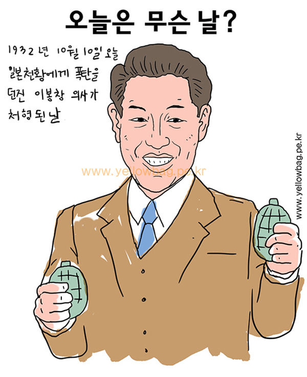1932년 10월 10일 오늘 히로히토 일본 천황에게 폭탄을 던진 이봉창 의사가 32세 나이로 일본 이치가와 형무소에서 처형된 날이다. 그는 1932년 1월 8일 일본 천황을 향해 수류탄을 던졌지만, 마차가 손상되고 말과 일본 고관 2명만 다치고 일본 천황은 다치지 않아 거사에 실패했고 그 자리에서 체포되어 그해 10월 10일에 교수형이 집행되었다.