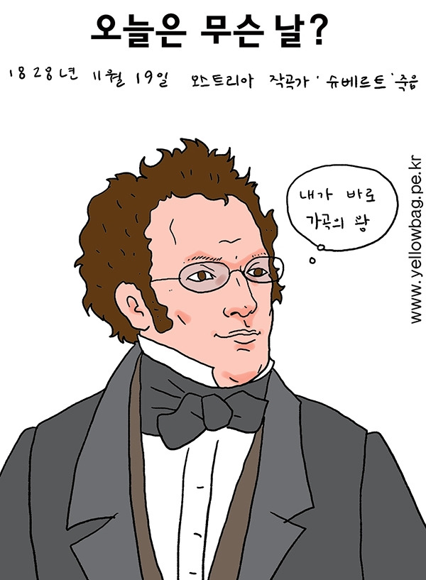 1828년 11월 19일 오스트리아의 작곡가 프란츠 페토 슈배르트 죽음. 그는 다른 곡들도 명작이 많지만 특히 독일 가곡에 뛰어난 작품이 많으며 19세기 독일 가곡 형식의 창시자이다. 그는 여러가지 의문점을 남기고 31세의 젊은 나이로 병사했다. 짧은 생애에도 불구하고 600여 편의 가곡, 13편의 교향곡, 소나타, 오페라 등을 작곡했으며 가곡의 왕이라 불린다.