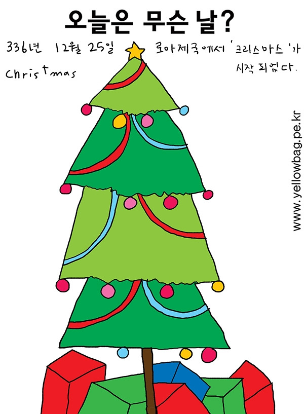 336년 12월 25일 로마제국에서 크리스마스가 시작되었다. 크리스마스는 예수 그리스도의 탄생을 기념하는 날이며 율리우스력의 12월 25일 기준으로 한다. 라틴어 그리스도-크리스투스 와 라틴어 모임 - 마사에서 온 영어 단어이다. 로마시대 기원전부터 로마 이집트 등 이교도 지역에서 태양 숭배 및 관련 신화에 따라 12월 25일 무적의 태양신 축일 혹은 농신 제로 기념하고 있었다. 동지에 즈음하여 이후부터 해가 길어지기 때문에, 어둠이 물러나고 빛이 세력을 얻어 만물이 소생해 나갈 수 있음을 기념하기 위해 12월 25일이 기념일로 지정되었다. 로마교회 대주교 율리우스 1세가 12월 25일 그리스도의 탄생일로 선포한 350년부터 이 축제가 기독교 축제로 인정되었다. 현재는 기독교 문화권에서 종교적인 의미를 초월하여 문화적인 행사로 발전되었다.
