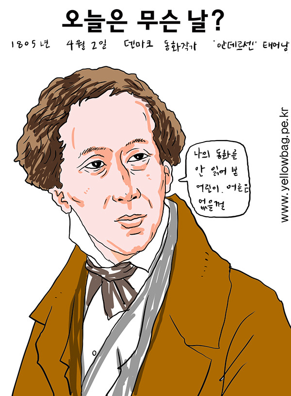 1805년 4월 2일 덴마크의 동화작가 한스 크리스티안 안데르센 태어남. 대학에서 희곡, 소설을 쓰면서 작가로서의 재능을 드러냈고 <즉흥 시인>이라는 작품으로 문학계의 호평을 받았다. 1835년부터 본격적인 동화를 쓰기 시작했는데, 어른들도 읽을 정도로 독자들의 반응이 좋았다. 그는 총 160여 편의 동화 작품이 모두 유명해져서 안데르센의 그림이 들어간 우표도 발행되는 영광을 누렸다. 그가 1875년 병으로 세상을 떠났을 때 그의 장례식에는 덴마크 국왕과 왕비도 참석했었다. 그의 주요 작품은 분홍신, 눈의 여왕, 인어공주, 성냥팔이 소녀, 벌거숭이 임금님, 미운 오리 새끼, 엄지 공주, 꿋꿋한 주석 병정, 나이팅게일 등이 있다. 안데르센의 동화를 한 번도 안 들어 본 사람은 없을 것이다. 그냥 옛날이야기처럼 당연히 알고 있는 동화들. 그러나 그의 동화는 슬픈 동화들이 많다. 성냥팔이 소녀, 눈의 여왕, 분홍신처럼 슬픈 동화들은 그의 불우했던 어린 시절의 기억들을 표현했다고 한다.
