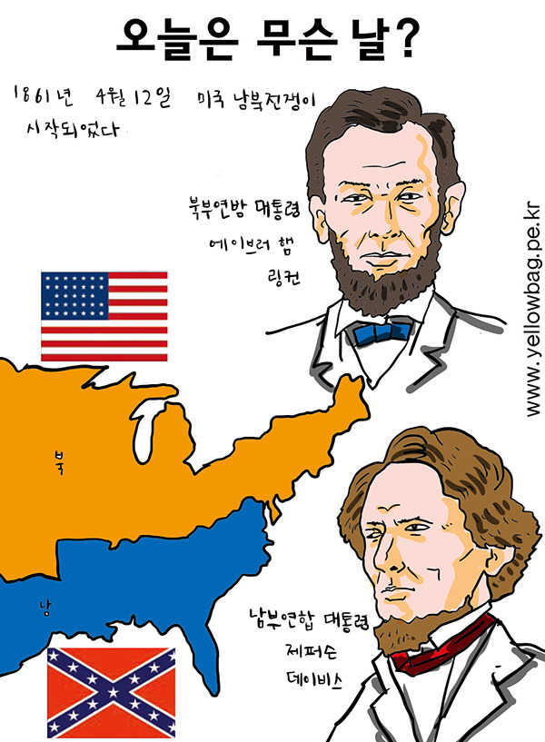 1861년 4월12일 미국 내전인 남북전쟁이 시작되었다. (남북전쟁 1861.4.12-1865.4.9)노예제 폐지를 주장하는 링컨 대통령이 연방 대통령으로 당선되자, 노예제를 찬성하는 미국 남부주들이 모여 미국 연방을 탈퇴하고 남부연합을 형성해 북군의 찰스턴 항의 섬터 요새를 포격한 것을 시작으로 4년 동안 벌어진 미국 내전이다. 전쟁 결과 남부가 패했고 노예제가 폐지되었다. 전쟁 기간 4년 동안 62만 명이 전사했는데 이는 1차, 2차 세계대전, 한국전쟁, 베트남 전쟁을 합친 미군의 사망수보다 더 많은 숫자이다.