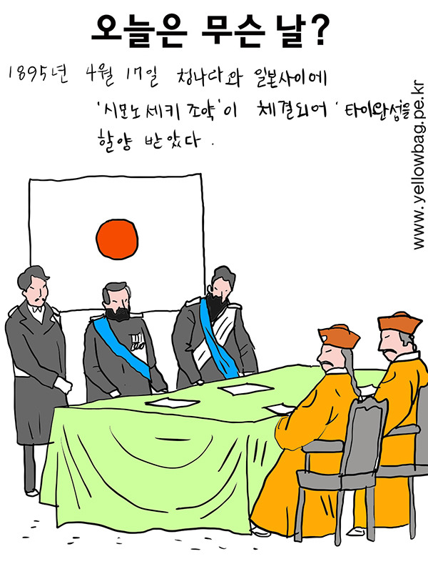 1895년 4월 17일 청나라와 일본 사이에 시모노세키 조약이 체결되었다. 이 조약으로 대만을 할양 받음.우리나라의 동학운동으로 정부가 청나라와 일본에 파병을 요청하였고, 이로 이해 청일전쟁이 일어났다.이 청일전쟁으로 청나라는 일본에 패하여 강화조약을 체결하게 되었다. 시모노세키 조약의 내용은 청나라는 조선으로부터 종주권을 영구히 포기한다. 청나라는 랴오둥 반도, 타이완 섬(대만), 펑후제도 등 여러 섬을 일본에 할양한다. 청나라는 일본에게 배상금 2억 냥(당시 청나라의 3년 치 예산에 해당하는 큰 금액이다) 청나라는 충칭, 항저우 등 개항과 일본인의 거주 영업 무역의 자유를 승인한다. 일본은 이 조약으로 조선에서 청나라가 가지는 모든 권리를 박탈시켜 청나라를 배제시켰다. 그러나 6일 뒤 러시아가 독일, 프랑스를 끌어들여 삼국간섭으로 저지시켰다. 이후 조선의 친청 정부는 친러 정부로 전환되었다. 조약으로 일본은 대만을 할양받았고, 지금 영토분쟁이 일고 있는 센카쿠(중국명 댜오위다오)를 점유했다. 나라가 힘이 없으면 이런 굴욕적인 조약도 맺게 된다. 우리나라도 그러하였고, 청나라도 그러하였다. 지금 중국은 그 당시 힘없는 청나라가 아니기 때문에 일본과 센카쿠(중국명 댜오위다오)의 영토 분쟁에서 물러서지 않고 있다.