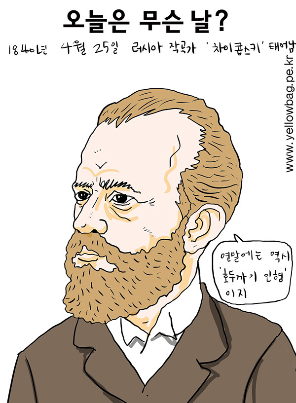 1840년 4월 25일 러시아의 작곡가 지휘자 '표트르 일리치 차이콥스키' 태어남. 낭만주의 시대의 러시아 제국의 음악가로서 백조의 호수와 호두까기 인형, 비창 교향곡의 작곡가이다. 백조의 호수, 호두까기 인형, 잠자는 숲 속의 미녀 등의 작품으로 고전 발레 음악 중 최고의 작품으로 평가받고 있고, 피아노 협주곡 1번, 바이올린 협주곡, 교향곡 4.5.6 번들이 음악회장에서 자주 연주된다. 감정을 섬세하게 말하는 그의 음악적 성향은 독일 낭만주의 음악 성향과 매우 가깝다. 그는 동성애자였고, 우울증이 심해 신경쇠약 증세까지 있었다. 53세 나이로 콜레라로 사망하였다. 그러나 부검 결과 비소 중독이라 밝혀져 그의 죽음에 대해서는 논란의 여지가 있다. 우리가 매년 연말, 크리스마스 때 듣고 보는 호두까기 인행의 행진곡이 귀에 익숙하다. 빰 빠바 빠바 빰 빠빠~