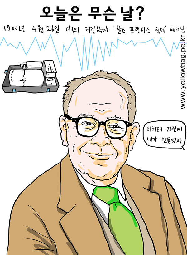 1900년 4월 26일 미국의 지진학자 찰스 프랜시스 릭터 태어남. 스탠퍼드 대학에서 공부하고 캘리포니아 대학 지진 연구소에서 연구하였고 지표상의 진동이 자동으로 기록되도록 만든 리히터 지진계를 1935년 개발하였다. 리히터 지진계는 리히터 척도로 지진의 강도를 표시하는데, 지진 기록의 최대 진폭과 진원으로 부터의 거리를 이용하여 계산한다. 지표상의 진동이 자동 기록되고 현재 전 세계적으로 사용되고 있다. 리히터 강도에서 1의 차이는 지진의 세기가 10배 차이 나는 것이다. 현재 사용되고 있는 리히터 규모라고 하는 것은 2에서 9까지 숫자로서 지진의 크기를 관측할 수 있게 되어 있다.