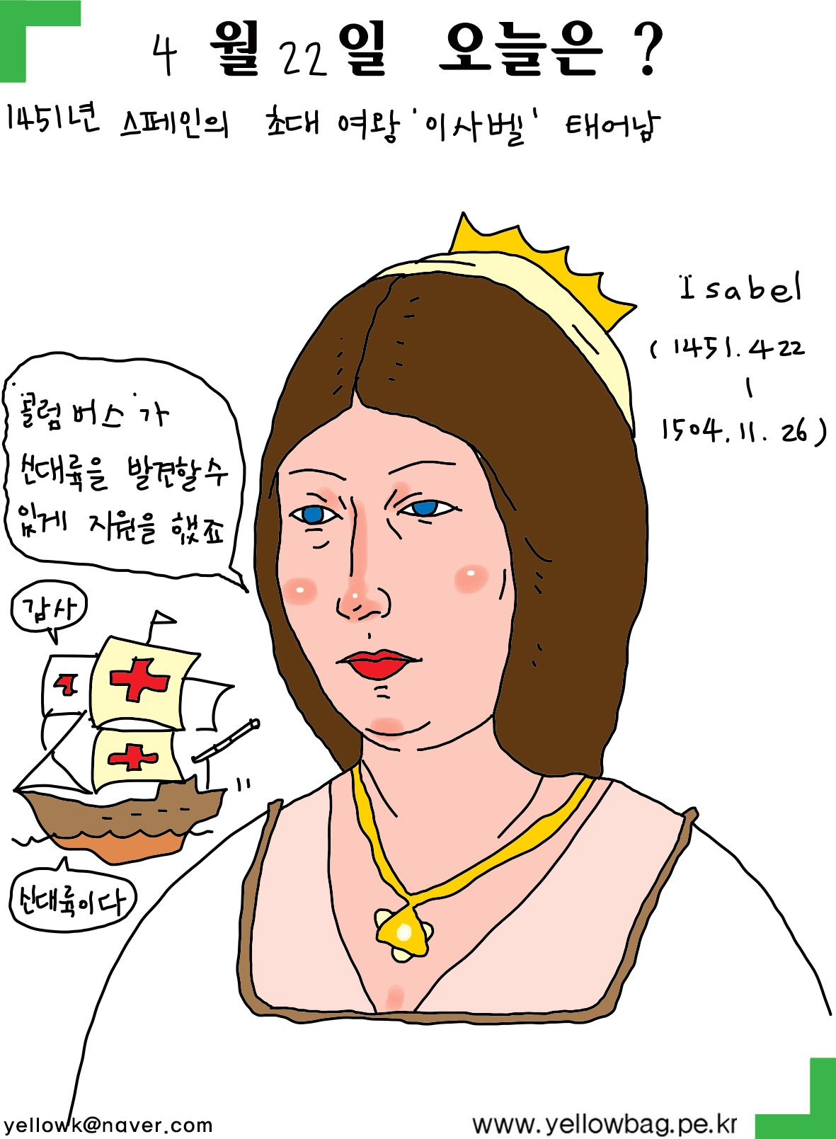 Isabel(1451.4.22-1504.11.26)스페인 이사벨라 영왕 태어남. 스페인의 초대 여왕이고, 카톨릭 여왕이라는 별명을 가지고 있다. 콜럼버스이 신대륙 진출을 도와주웠고, 그 덕분에 스페인에 해외 식민지 개척시대가 도래하였고, 그 곳에서 얻은 수많은 재물로 스페인은 부유해졌다. 이사벨여왕의 치세를 스페인의 황금시대로 정의하는 사람들이 많다.