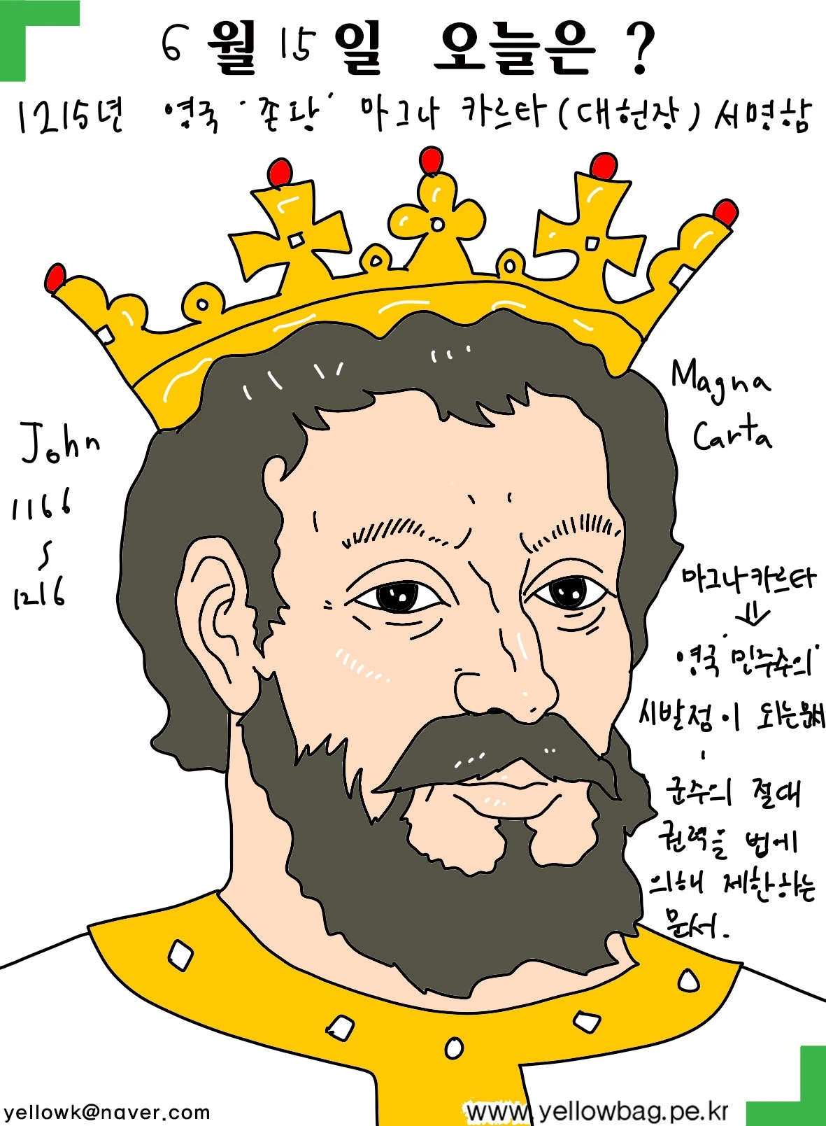 마그나카르타는 영국의 민주주의의 시발점이 되는 문서로 국왕의 절대 권력을 법에 의해 제한할 수 있다는 내용의 문서이다