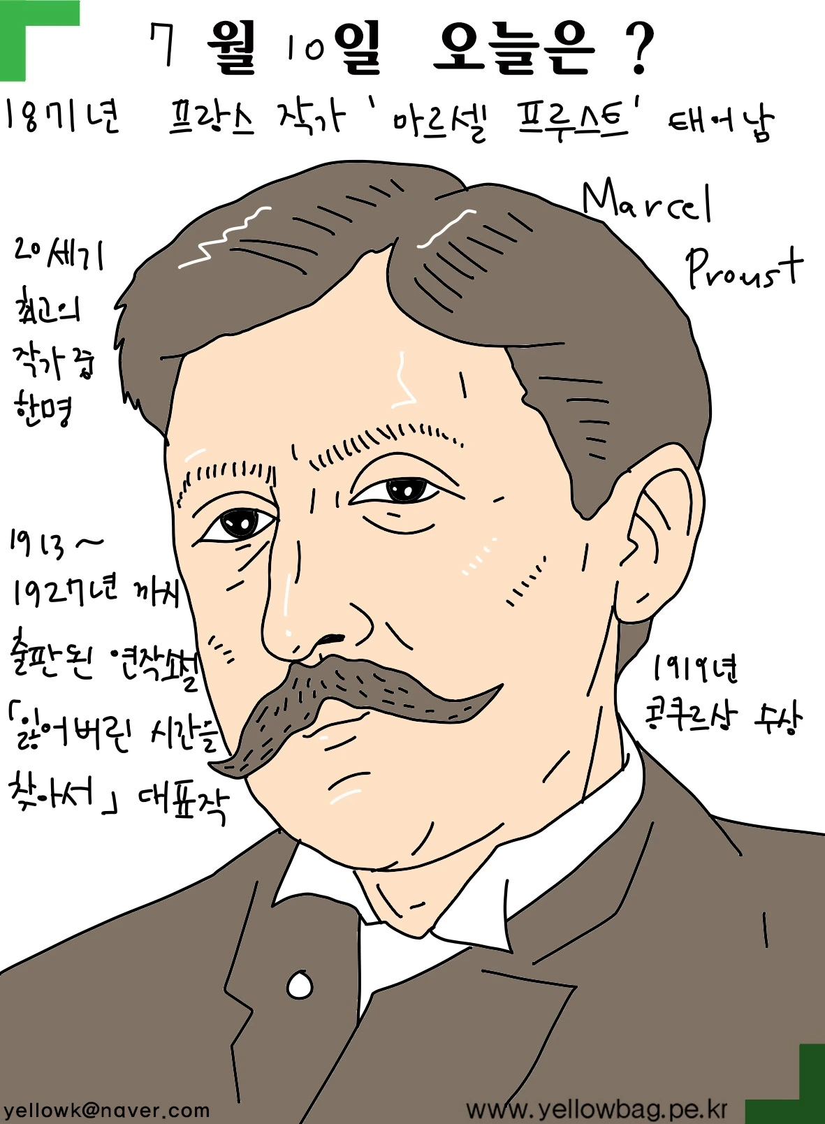 그는 20세기 최고의 작가 중 한명이며 1913-1927년까지 출판된 양과 질에서 최고작품인 연작소설 <잃어버린 시간을 찾아서> 가 있다. 그는 천식이 심해서 태양광선, 향수, 걸의 소요도 참기 힘들어 코르크로 밀폐된 방에서 수도사처럼 글을 썼다.