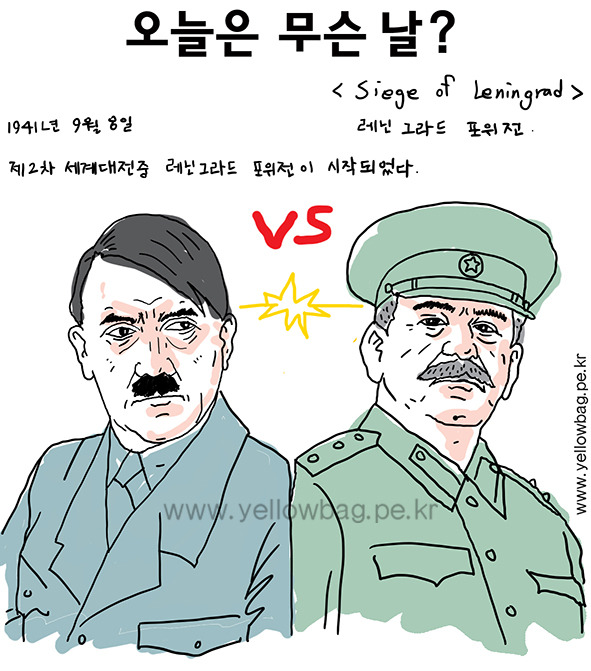 레닌그라드는 지금은 상트페테르부르크라 불리는 도시이다. 1941년 9월 8일은 제2차 세계대전 중 독일이 소비에트 연방의 도시 레닌그라드를 포위공격을 시작한 날이다. 레닌그라드 포위전은 그 뒤 872일 후 1944년 1월 27일에야 끝이 났다. 이 전투는 역사상 가장 길고 가장 많은 사상자인 약 3백만 명의 사상자가 발생한 전투로 꼽힌다.//같은 시대 유명한 2명의 독재자 히틀러와 스탈린이 자존심을 걸고 맞붙은 전투. 히틀러나 스탈린은 털끝 하나 다치지 않았지만, 실제 전투를 치른 독일군들이나 872일을 추위와 배고픔에 포위당해 있었던 레닌그라드 시민과 군인들은 의미 없는 죽음을 당한 전투다. 위에 있는 사람들은 전쟁을 부추기고, 전쟁을 하고 당하는 사람은 언제나 힘없는 아래에 있는 사람들이다. 이 포위 작전으로 굶주린 시민들은 인육을 먹기도 했다니 전쟁은 정말 일어나지 않는 것이 제일이다.