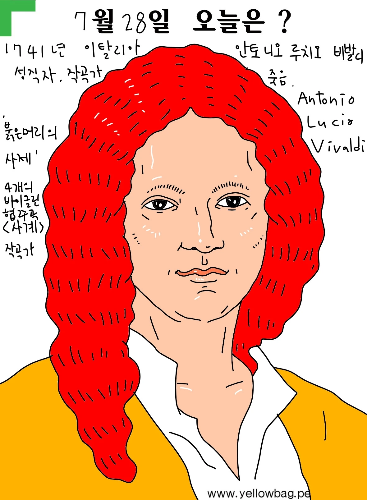 1714년 이탈리아 성직자 작곡가 '안토니오 비발디' 태어남 4개의 바이올린 협주곡으로 유명한<사계> 대표작 빨강머리라 '붉은머리의 사제'라는 별명이 있음
