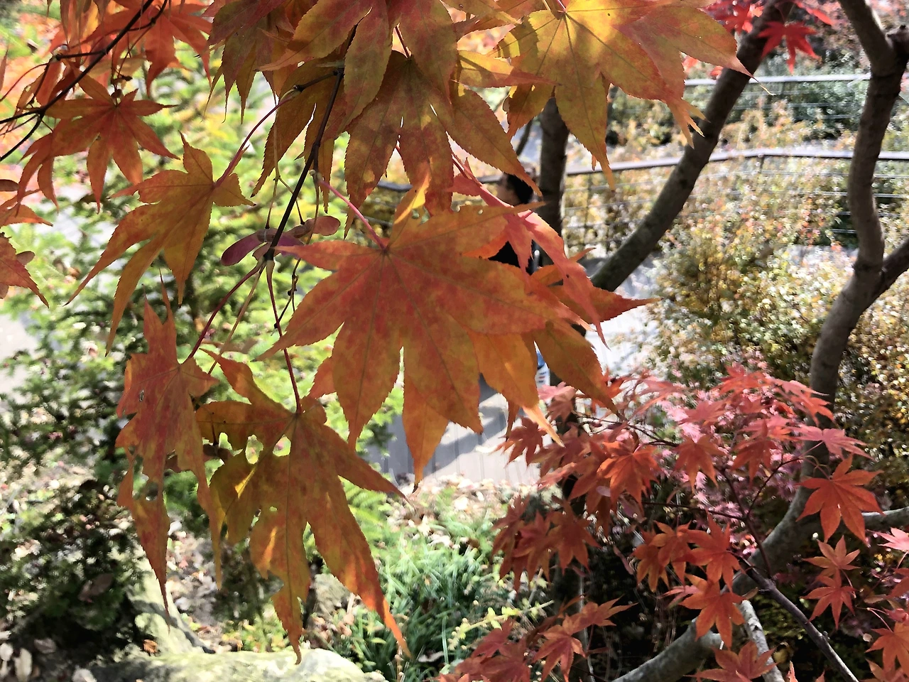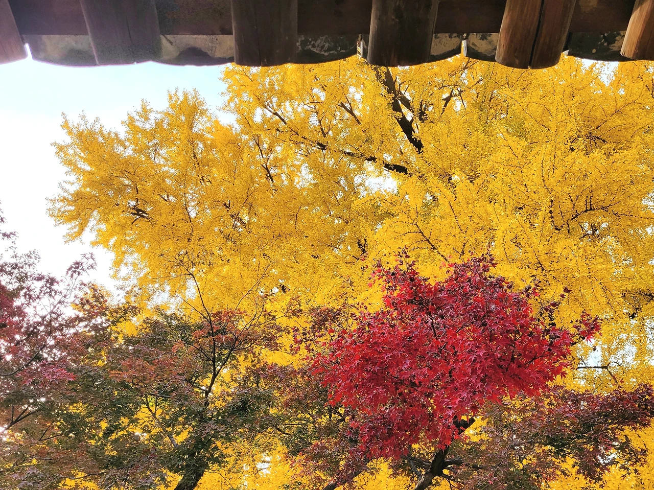 처마 아래에 앉아서 보는 단풍이 알록달록 예쁘다.