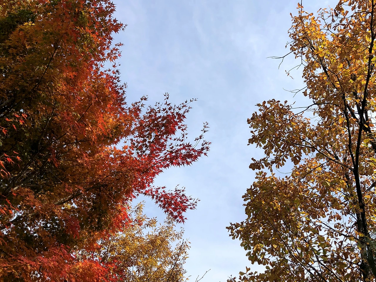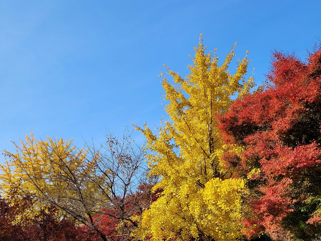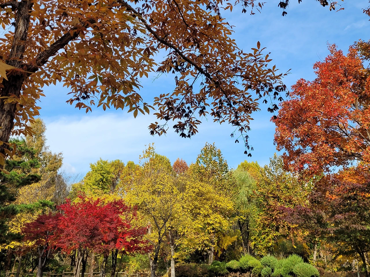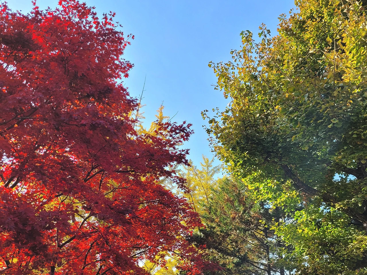 파란 하늘 아래 노랑, 빨강의 나무들.