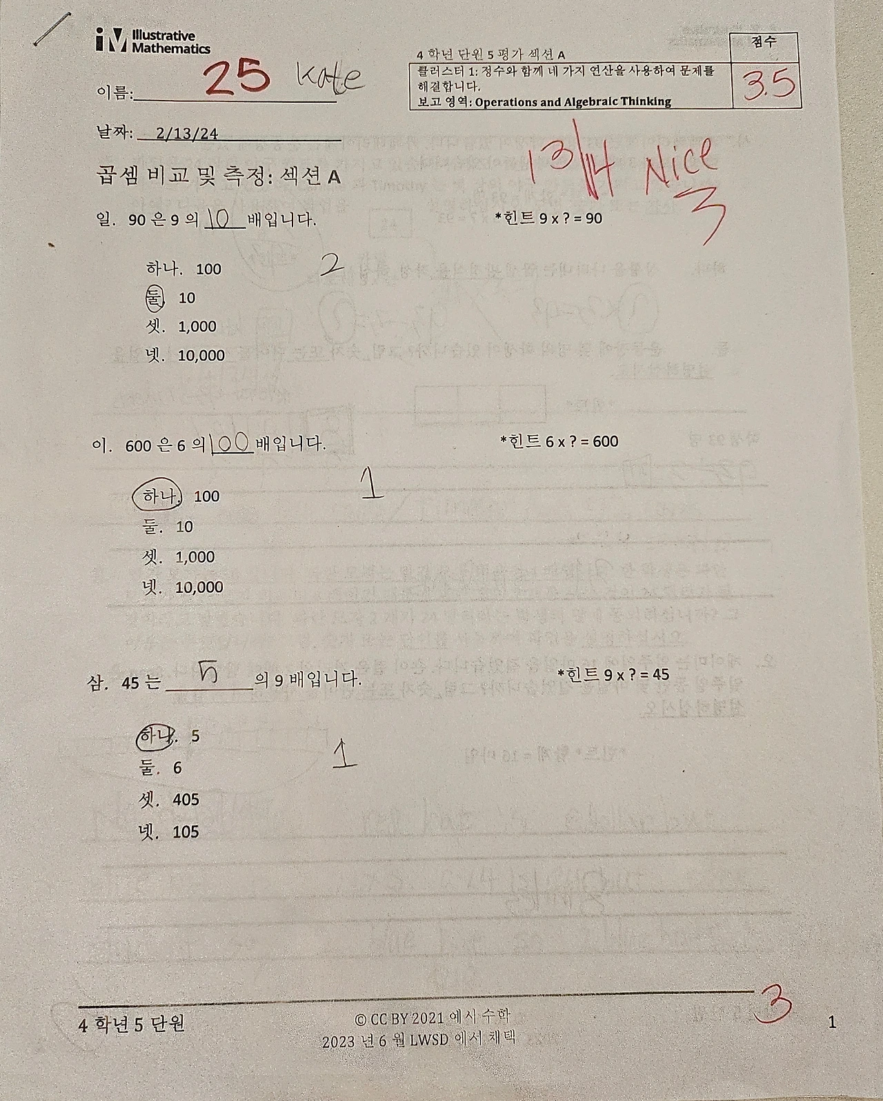 알파벳과 간단한 인사말 정도를 알고 온 초등학교 4학년 우리 둘째는 들어가자마자 영어가 부족한 아이들을 모아서 영어를 배우는 반에 들어갔다. ENGLISH 수업은 같은 반에 영어를 잘 못하는 러시아, 우크라이나 친구들과 함께 따로 배정된 반으로 가서 수업을 듣는다. 나머지 체육이나 수학 등의 수업은 원래 반 친구들과 함께 한다. 들었던 대로 역시 미국의 수학 진도는 한국보다 느리다. 진도가 1년 정도 늦은 수학을 풀다 보니 둘째는 본인이 수학천재라도 된냥 매일 백점을 맞았다고 좋아한다. 미국이 원래 쉬운 거라고 말을 해주면서도 수학에서라도 자신감을 느끼는 둘재 모습을 보니 다행이라는 생각도 든다. 수학에 대한 자신감을 유지하기 위해서 한국에서 가져온 수학문제집을 풀고 있다.