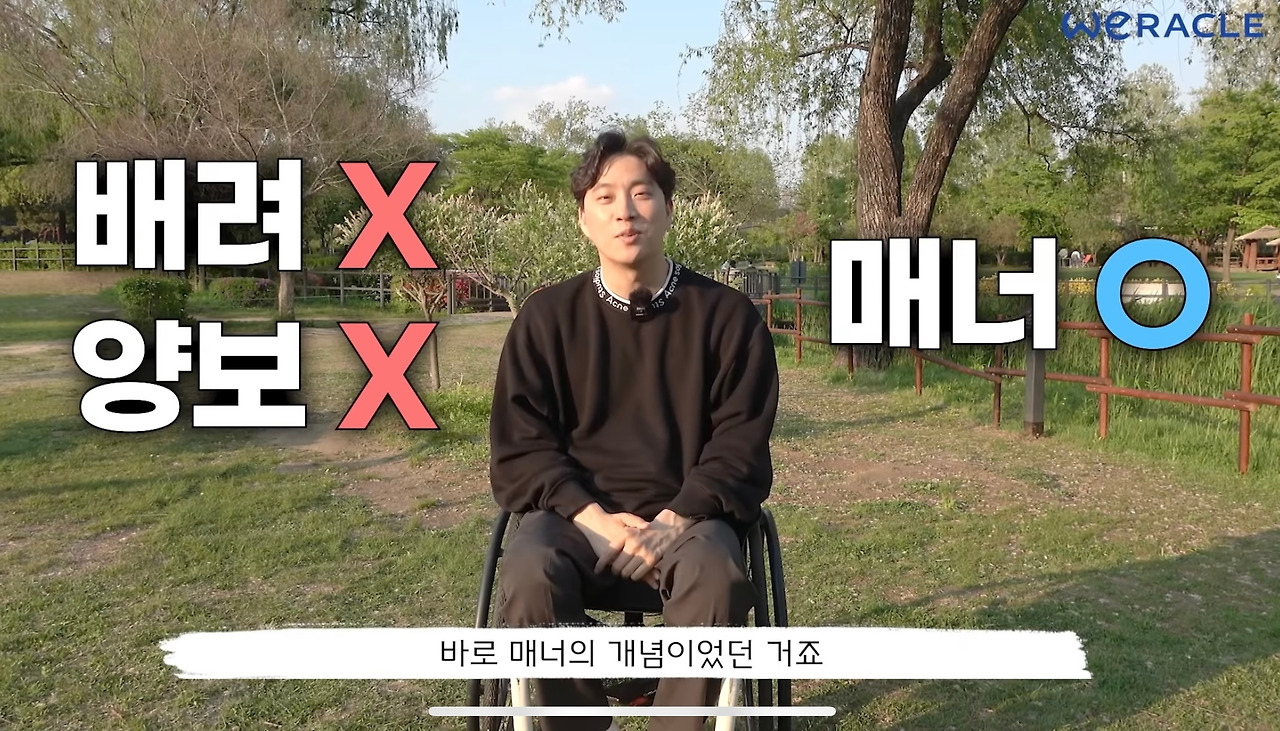 위라클 영상을 보면서 새로 전학 온 청각장애인 친구를 괴롭히지 않는 환경을 만드는 것이 배려라고 생각하는 선생님의 태도가 생각났다. 선생님의 그 말로 내가 새로 온 친구들과 관계를 설정할 수 있는 다양하고 무한한 가능성이 사라지고 배려의 대상으로 전락해 버렸다. 전학 온 친구를 장애라는 이유로 괴롭히지 않는 건 배려가 아닌 우리가 흔히 아는 가정교육, 즉 매너의 영역이다. 영상을 보고 어릴 적 기억이 떠오르며 우리 사회의 인식과 태도가 변하지 않음에 조금은 서글펐다.