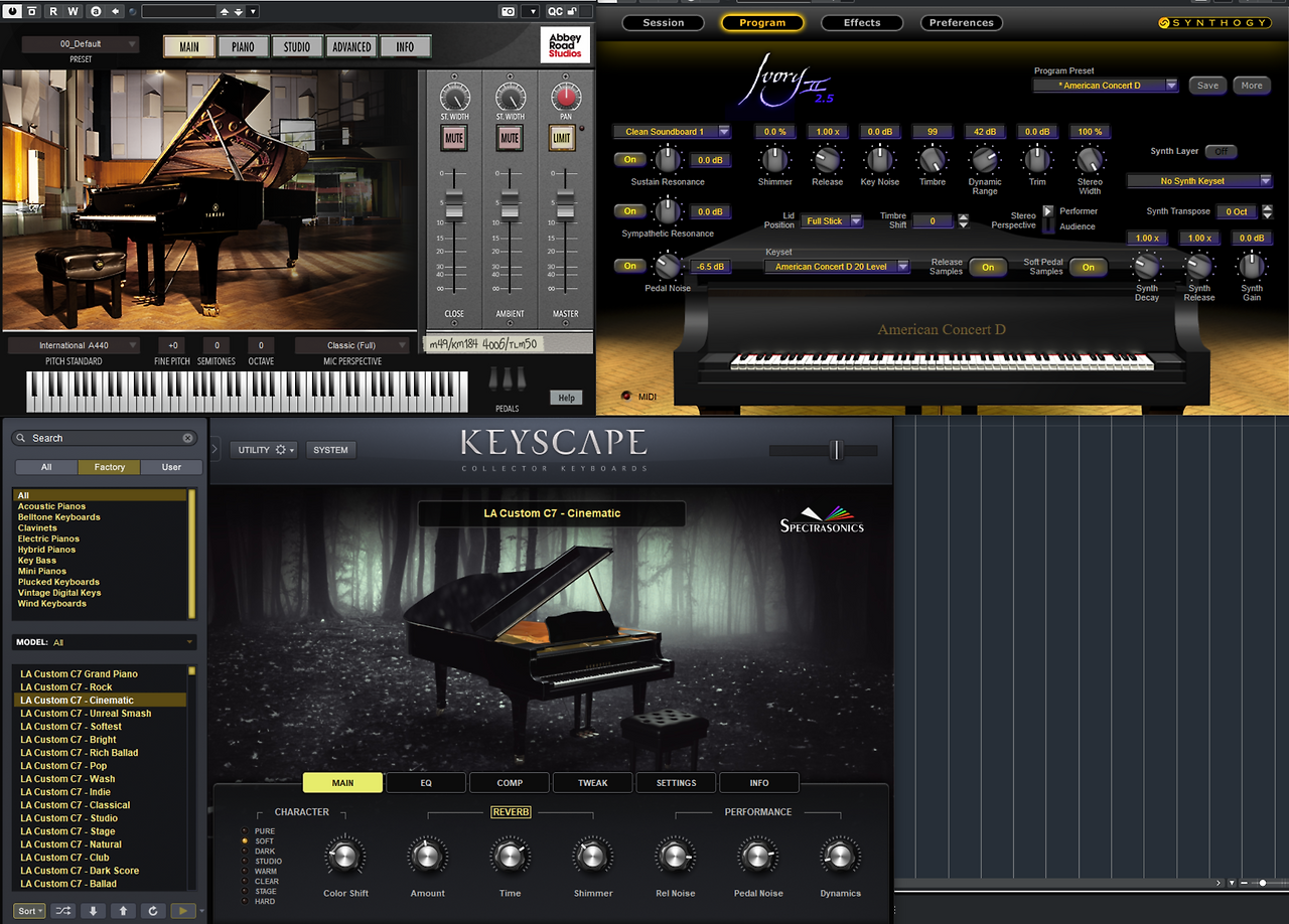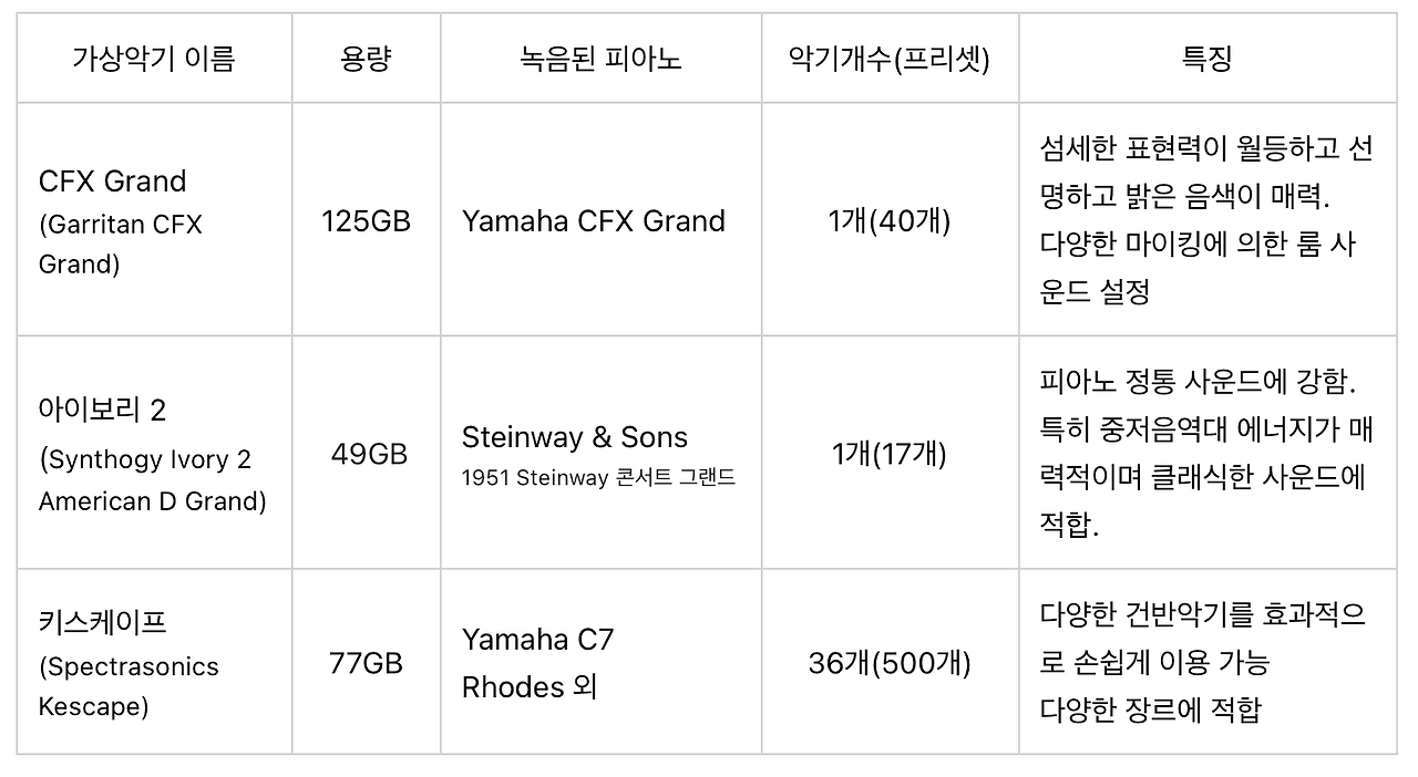 같은 스타인웨이 피아노를 이용해서 녹음하더라도, 만든 가상악기 회사마다 소리가, 터치가 모두 다 다릅니다. 녹음환경, 엔지니어, 소리를 구현하는 기술력과 방향까지 모두 다르기 때문입니다.