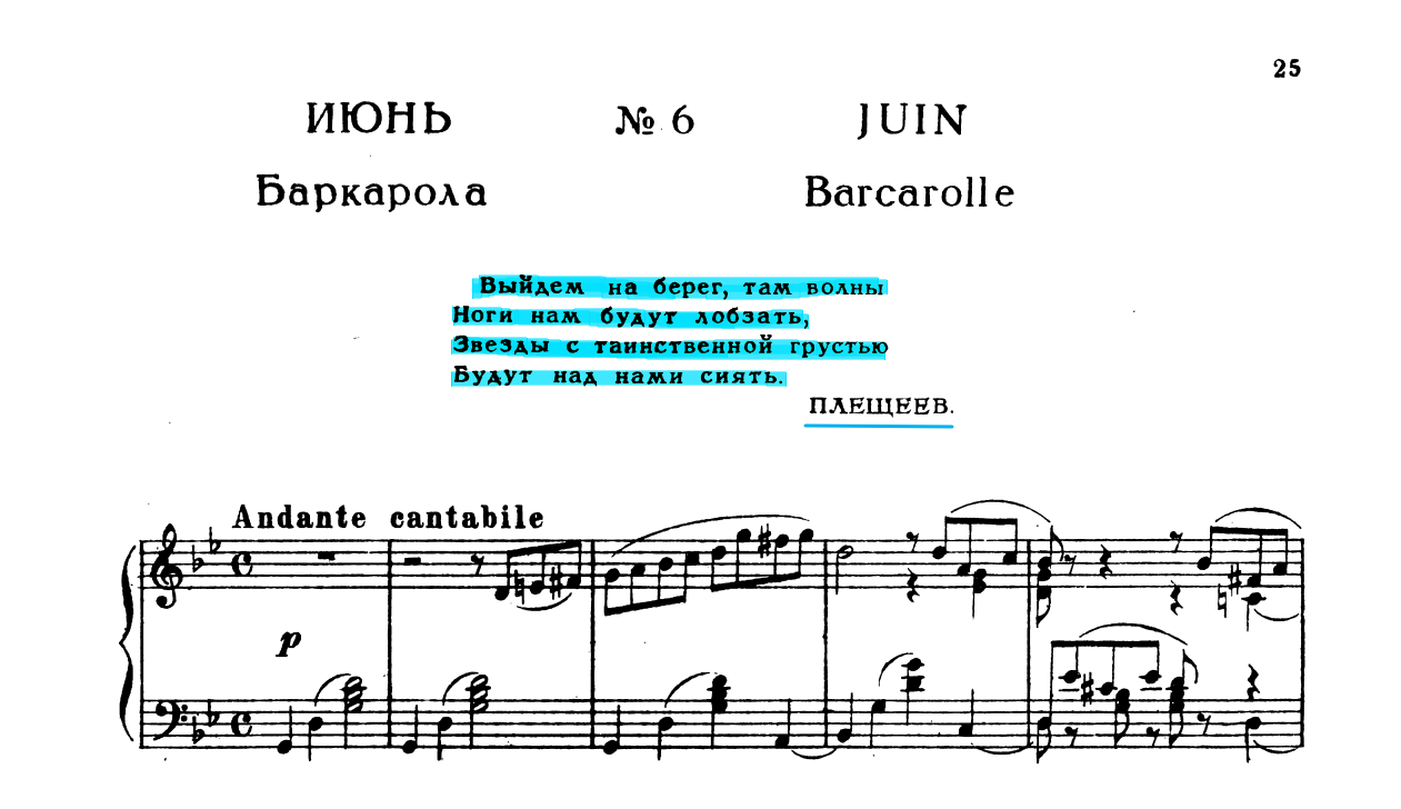 이 곡의 악보 첫머리에는 알렉세이 플레셰예프(Aleksey N. Pleshcheyev)의 시가 에피그래프로 적혀있다.