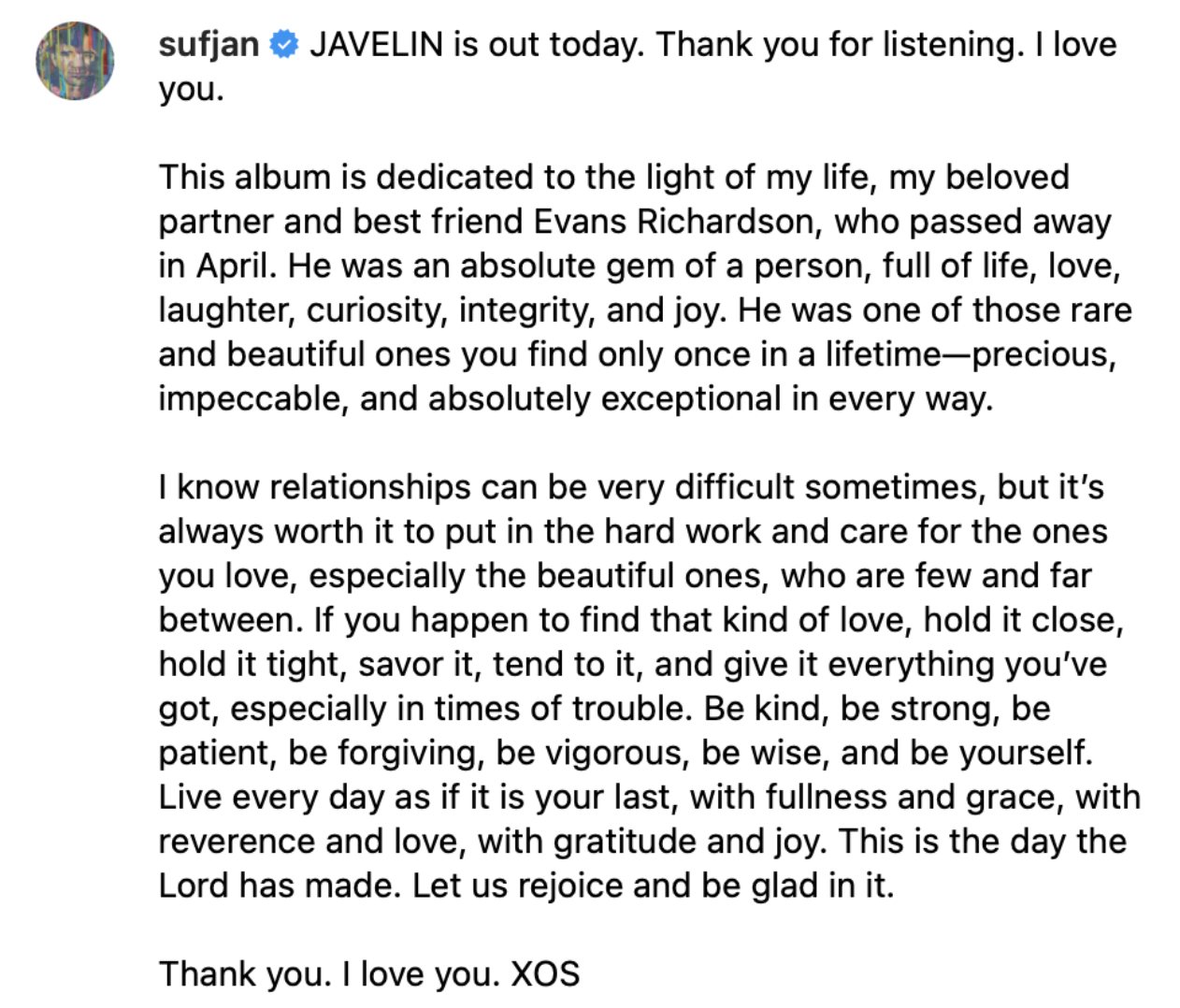 2023년 10월 수프얀은 <Javelin>을 발표하며, 그해 4월 세상을 떠난 자신의 파트너 에반 리차드슨(Evans Richardson IV)에게 이 앨범을 헌정했다. 절절한 사랑의 연서로 그를 얼마나 사랑하는지 처음으로 세상에 고백한 것이다. 그 문장들은 아직도 눈에 선하다.