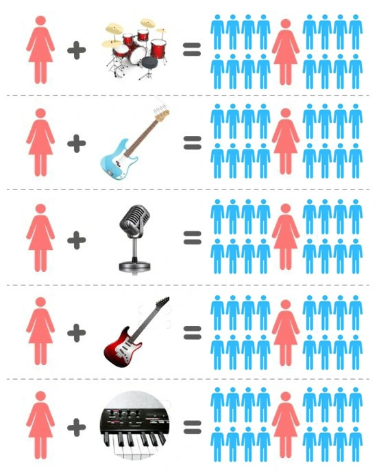 항상 베이스 연주자의 손가락을 보며 베이스 음에 눈과 귀를 열고 있었던 저를 상상해 보니 이 그림이 생각났습니다. 밴드 연주자의 성에 따른 팬의 성비 분포도를 그린 그림인데요.
