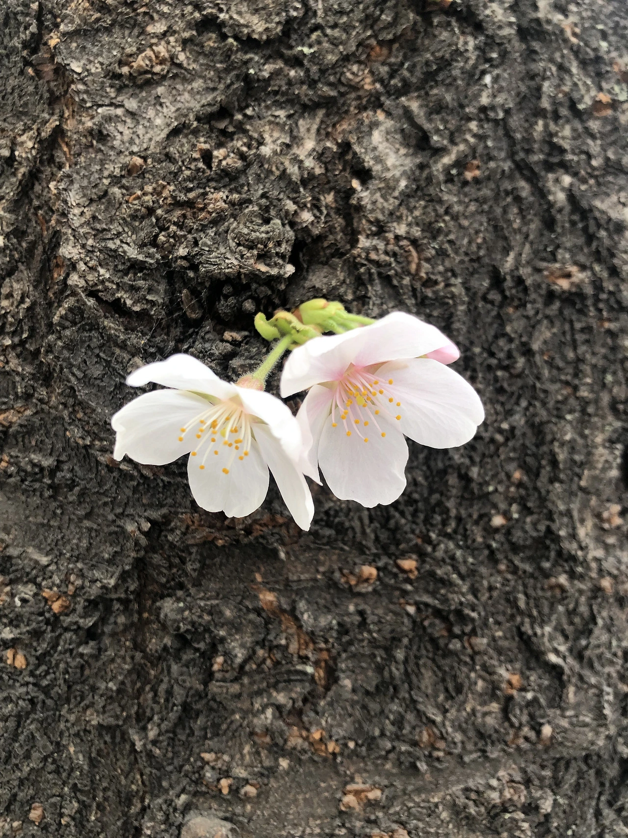 그러다 발견한 벚꽃 두 송이. 나무기둥에 새싹을 틔우고 꽃을 피워냈네요. 마치 벚꽃나무가 제 몸에 특별한 브로치 장식이라도 단 것처럼 귀엽고 다정하면서도 씩씩한 훈장처럼 보였습니다. 기특하죠. 호젓해 보이기도 하고요.