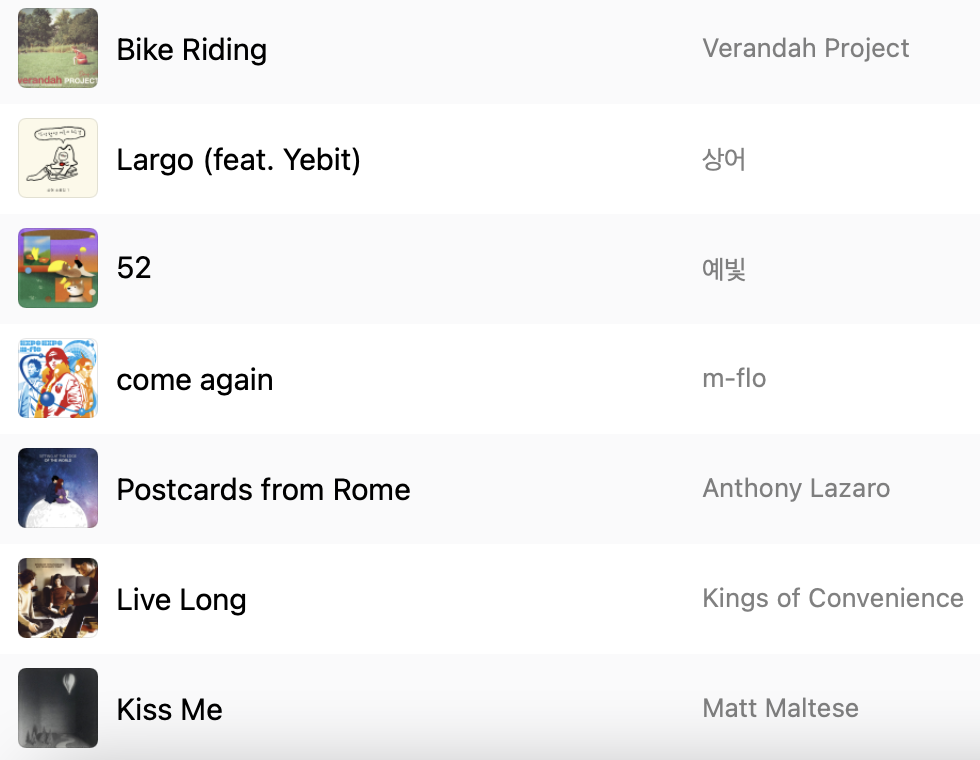 어제 라이딩하면서 들었던 음악들이다. 안전상 에어팟은 한쪽만 끼고, 간간히 대화도 해야 하니 볼륨은 적당히, 오늘은 꽉 차지 않은 사운드로, 봄의 신록처럼 사근사근한 곡들로 채웠다.