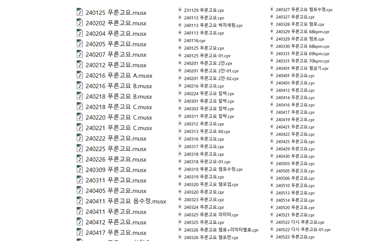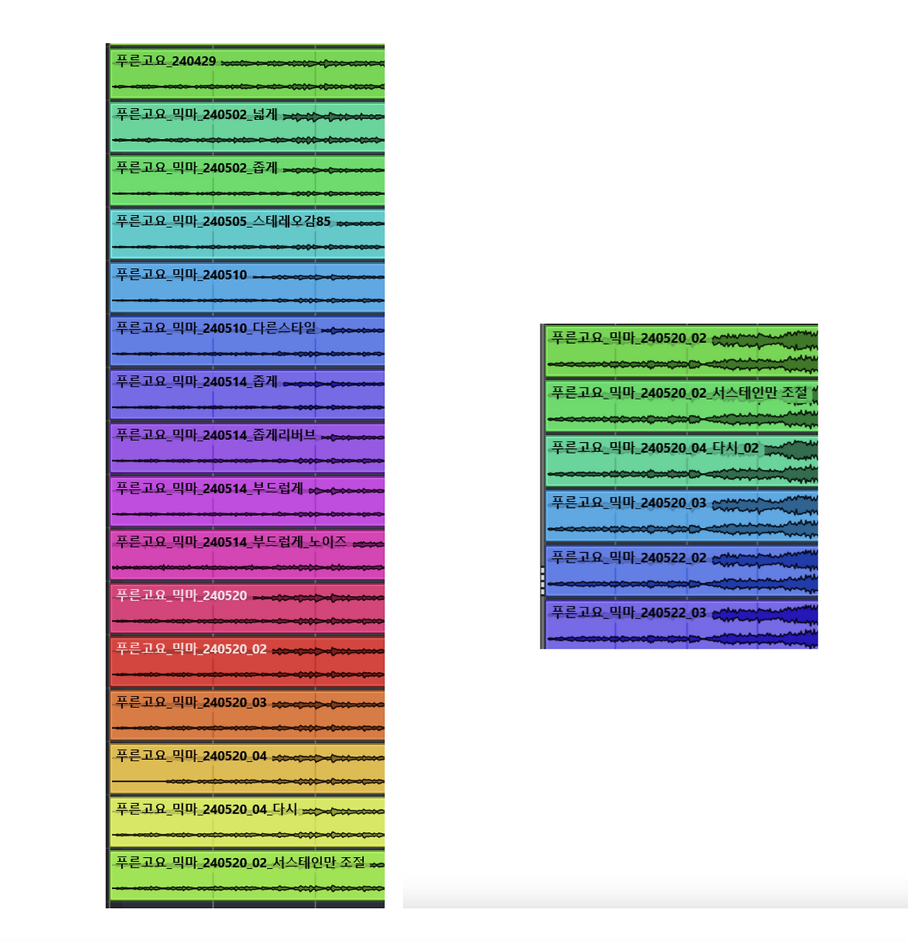 엔지니어님께서 사운드 레퍼런스 곡을 분석플러그인으로 분석하셨는데, (임윤찬의 쇼팽 연습곡 앨범, 마리에 아와디스의 발라드곡) 그것은 좌우로는 좁고, 앞뒤로는 긴 소리였습니다. 여러 시행착오 속에서 소통하며 만들어나간 끝에 제가 그렸던 사운드를 찾을 수 있었습니다. 요즘 대중들이 선호하는 음향과 정반대에 배치하는 사운드이기도 한데, 다이나믹 차이를 거의 그대로 반영해서 음압경쟁도 어느 정도 포기한 푸른 고요는 이 사운드가 맞다고 생각했습니다. 여러 케이스를 비교해서 소리를 찾고 선택할 수 있도록 근 한 달 동안 사운드를 만들어주신 하재현 엔지니어님께 다시 한번 감사를 드리고 싶습니다.