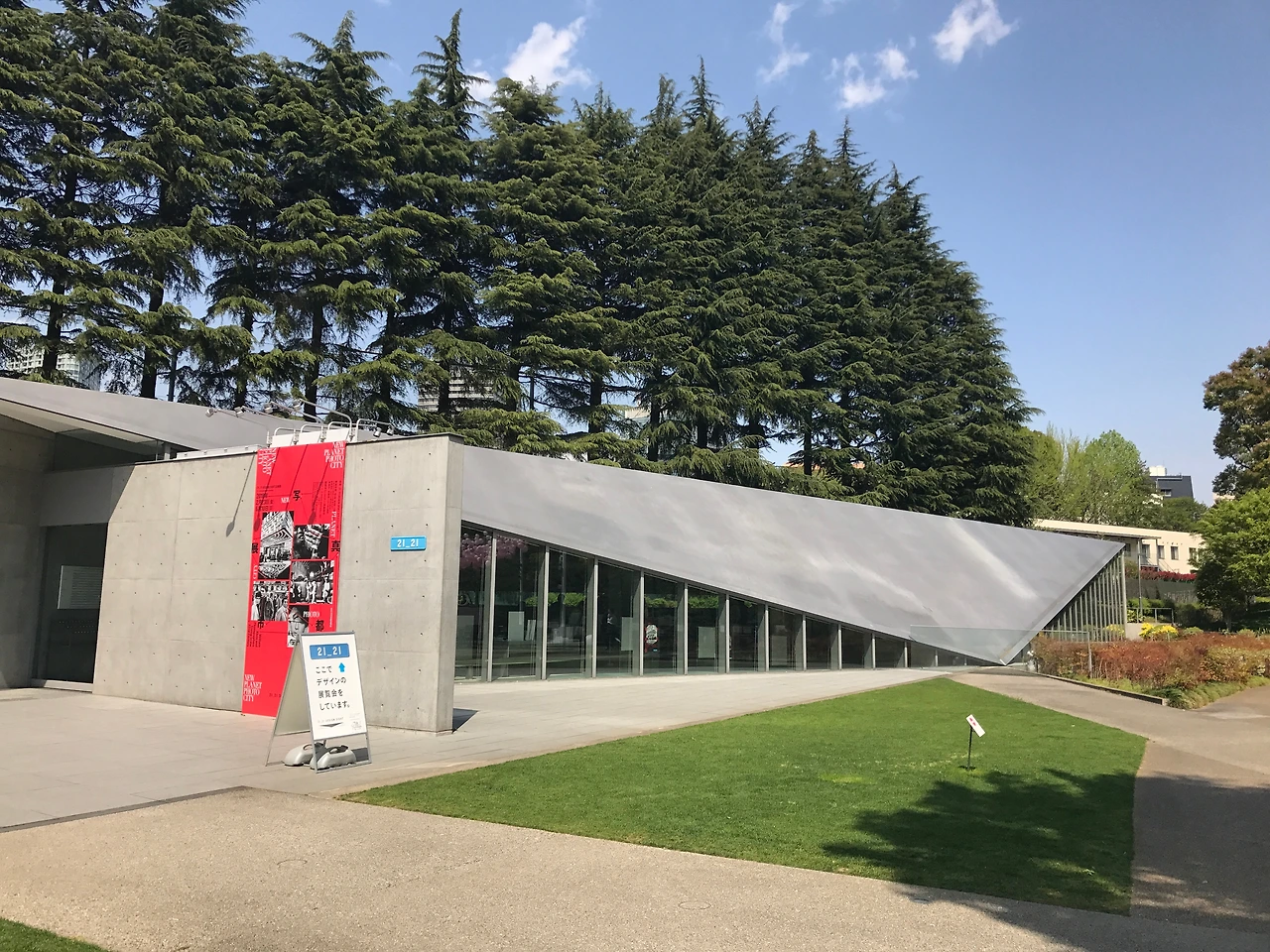 국립신미술관을 나와 다음 목적지인 21_21 디자인 사이트21_21 Design Sight를 향해 걸었다. 빽빽하게 들어찬 높고 낮은 건물들과 그 사이를 바삐 오가는 인파들이 도시의 일상을 생생히 보여주었다. 국립신미술관에서 몇 블록 걷자 곧 미드타운 지역의 푸른 공원을 만날 수 있었다. 반짝이는 무채색 건물들 사이에서 햇빛을 받은 나무들은 유난히 푸르러 보였다. 마침 점심시간이라 흰 셔츠를 입은 직장인들이 공원 안에서 삼삼오오 이야기를 나누고 있었다. 핸드폰 지도의 화살표도 공원 안을 가리키고 있었기에 나도 그들 사이로 들어가 잠시 공원을 산책했다. 양옆으로 늘어선 높은 건물들 사이에서 작은 공원은 테마파크 같기도 하고 사막의 오아시스 같기도 했다. 잘 닦인 산책로와 역시 잘 정리된 화단과 나무들은 몹시 깨끗한 인상을 주었다. 언뜻 보기에 공원은 넓어 보이지 않았지만 안으로 들어갈수록 점점 넓은 공간이 나타났다. 산책로를 따라 반려견과 걷거나 조깅을 하는 사람들도 보였다. 한 켠에서는 분홍색 풍선으로 장식한 프랑스 샴페인 브랜드 샹동의 팝업 카페가 손님들을 맞이하고 있었다. 그리고 그 맞은편에 낮게 자리 잡은 회색 건물이 21_21 디자인 사이트였다.
