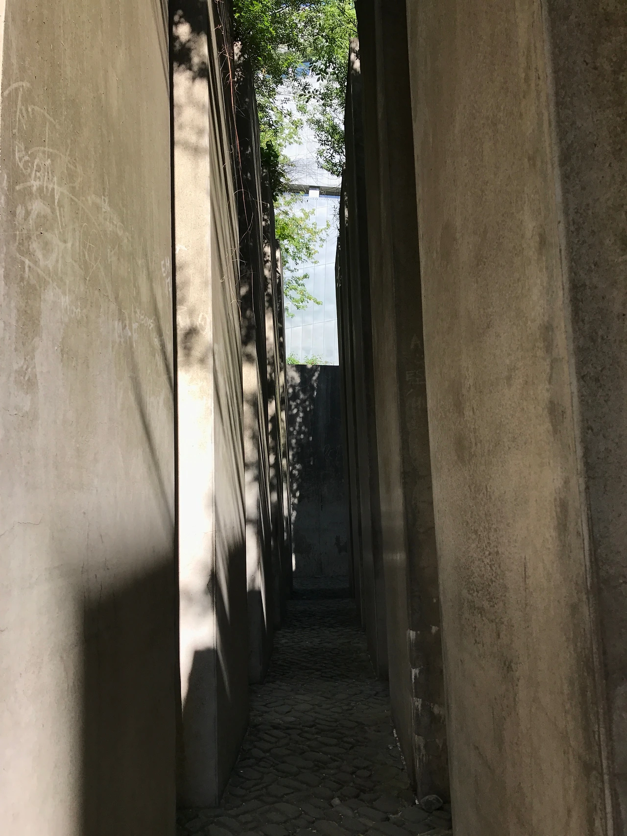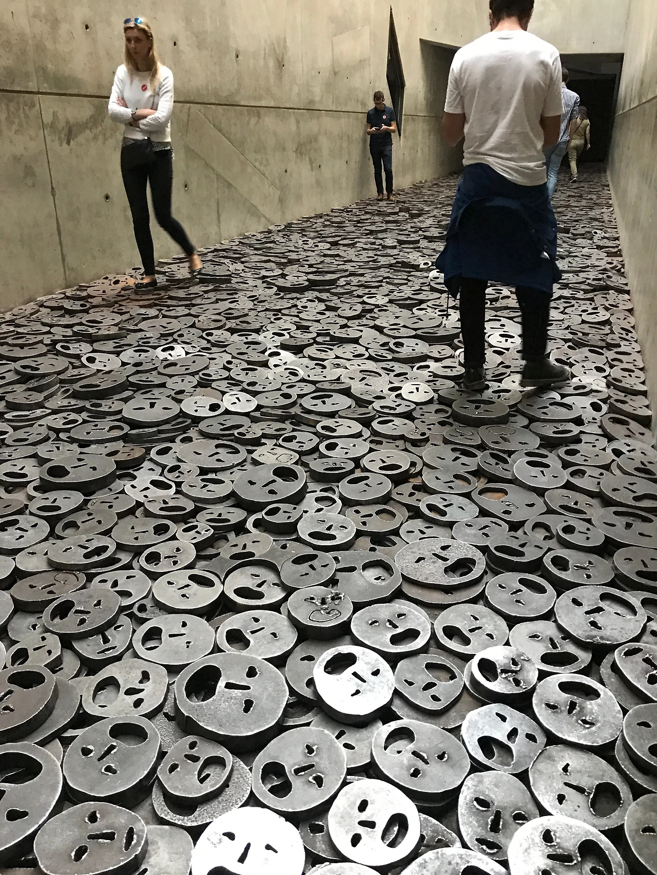 통로 끝은 망명의 정원The Garden of Exile으로 이어져 있었는데, 높이 솟은 네모 기둥이 좁은 간격으로 배치되어 있는 망명의 정원은 정원이라기보다는 예술가의 설치작업 같았다. 고개를 바짝 들어야 기둥 꼭대기에 심어진 올리브 나무 사이로 겨우 하늘을 볼 수 있었다. 높은 기둥 사이의 좁은 공간을 걷자니 답답하기도 했지만 그보다는 기울어진 바닥 때문에 걸음이 휘청휘청 불안했다. 리베스킨트는 독일을 떠나 새로운 땅에 닿은 망명자들의 삶이 이러했다고 말하고 싶었을 것이다. 환히 웃는 망명자들의 사진과 정원의 불안정한 공간이 온전하지는 못하더라도 그 시대의 일부를 관람객들에게 전하고 있었다. 정원을 나와 통로를 되돌아가 위층으로 이어진 계단을 올라갔다. 놓인 길을 따라 걷다 보니 사람 얼굴처럼 눈, 코, 입이 뚫린 동그란 철판이 가득 깔린 공간이 나타났다. 공간의 폭은 좁았지만 길이는 꽤 깊었고 하늘을 향해 뚫린 벽은 아주 아주 높이 솟아 있었다. 얼굴 모양 철판 위를 걷는 사람들의 발걸음에 철판이 부딪히는 날카로운 소리가 무겁게 공간을 울렸다. 거칠게 뚫린 눈, 코, 입을 가진 얼굴들은 웃고 있는지 소리를 지르고 있는지 그도 아니면 그저 모든 구멍을 최대한 확장한 것인지 알 수 없는 기괴한 표정을 짓고 있었다. 그들의 알 수 없는 표정만큼이나 그 위를 밟고 있는 사람들의 표정 또한 복잡했다. 철판에 새겨진 얼굴에 비해 훨씬 섬세했으나 그 내면을 추측할 수 없기는 마찬가지였다. 흑백사진 속 망명자들의 얼굴과 기괴한 철판 얼굴과 관람객들의 얼굴은 불안, 고통, 슬픔 등의 단어로는 설명할 수 없는 복잡하고 미묘한 표정을 담고 있었다. 이렇듯 리베스킨트 건물은 유리창 뒤에 놓인 유물을 통해 과거에 대해 이야기하기보다 공간을 통해 관람객이 과거를 경험하게 했다. 역사와 그 역사를 기억하는 박물관의 역할은 글이나 사진, 유물과 같은 기록을 보관하고 전시하는 것이 아니다. 관람객이 그 시대를 생각하고 느끼는 것, 나아가 오늘의 역사를 되돌아보게 하는 것이다. 그리고 리베스킨트가 만든 공간에서 과거와 현재는 관람객을 매체 삼아 긴밀히 연결되어 있었다.