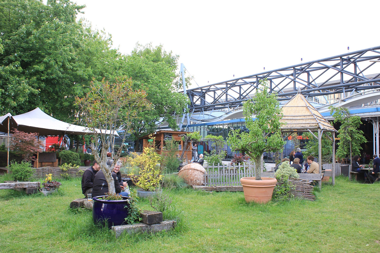 공원을 한 바퀴 둘러보고 나니 벌써 해가 지려 하고 있었다. 위에서부터 아래로 내려온지라 나는 그제야 그랑홀을 볼 수 있었다. 그랑홀은 이미 문을 닫았지만 그 앞 광장에는 꽤 많은 사람들이 있었다. 친구를 기다리는 사람, 아이와 산책을 나온 사람, 삼삼오오 모여 깔깔대며 이야기 꽃을 피우는 어린 학생들까지, 많은 이들이 빌레뜨에서 각자의 방법으로 시간을 보내고 있었다. 그랑홀 옆에 잘 꾸며진 정원에 사람들이 모여있는 게 보였다. 가까이 가보니 사람들은 짚으로 만든 정자 밑에서, 간이 테이블에서, 혹은 나무토막에 걸터앉아 차를 마시고 있었다. 알고 보니 그곳은 간단한 차와 음료를 판매하는 카페였다. 순간 이상한 나라의 앨리스에 나오는 티파티에 초대되면 이런 기분일까 하는 생각이 들었고 당장 친구를 불러 한 자리 차지하고 싶은 마음이 간절했다. 그리고 곧이어 빌레뜨의 카페라면 당연히 이 정도는 되어야지 라는 왠지 모를 뿌듯함과 함께 카페, 아니 정원을 나왔다.