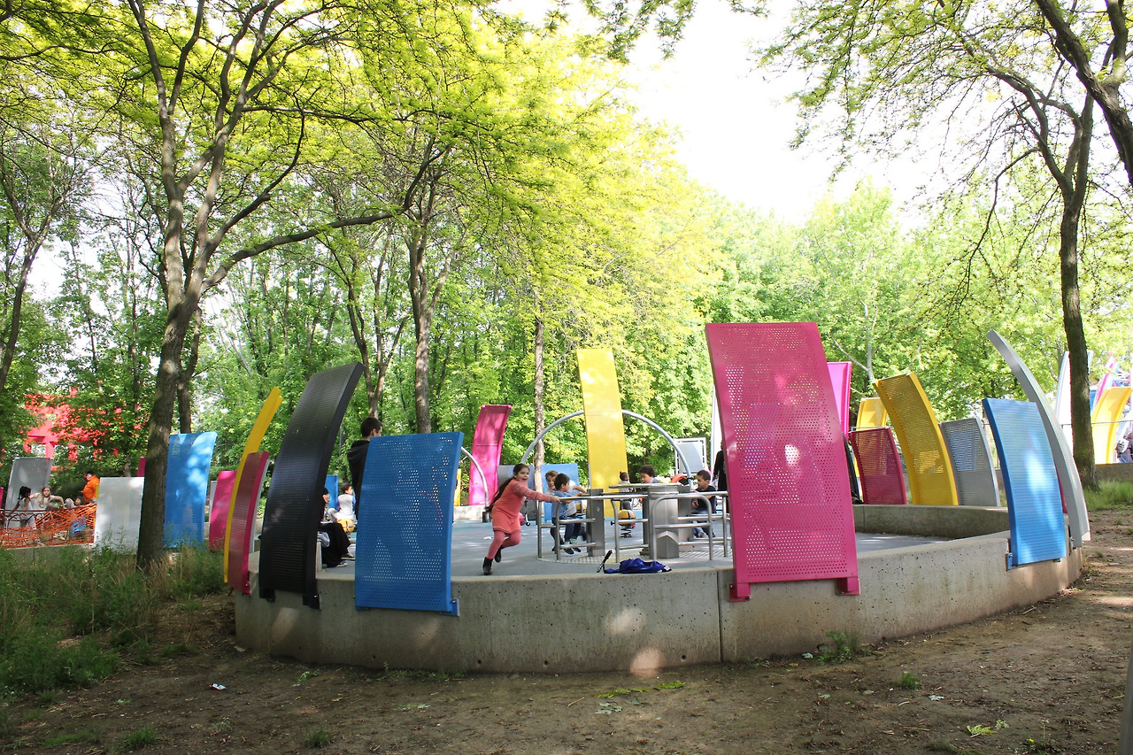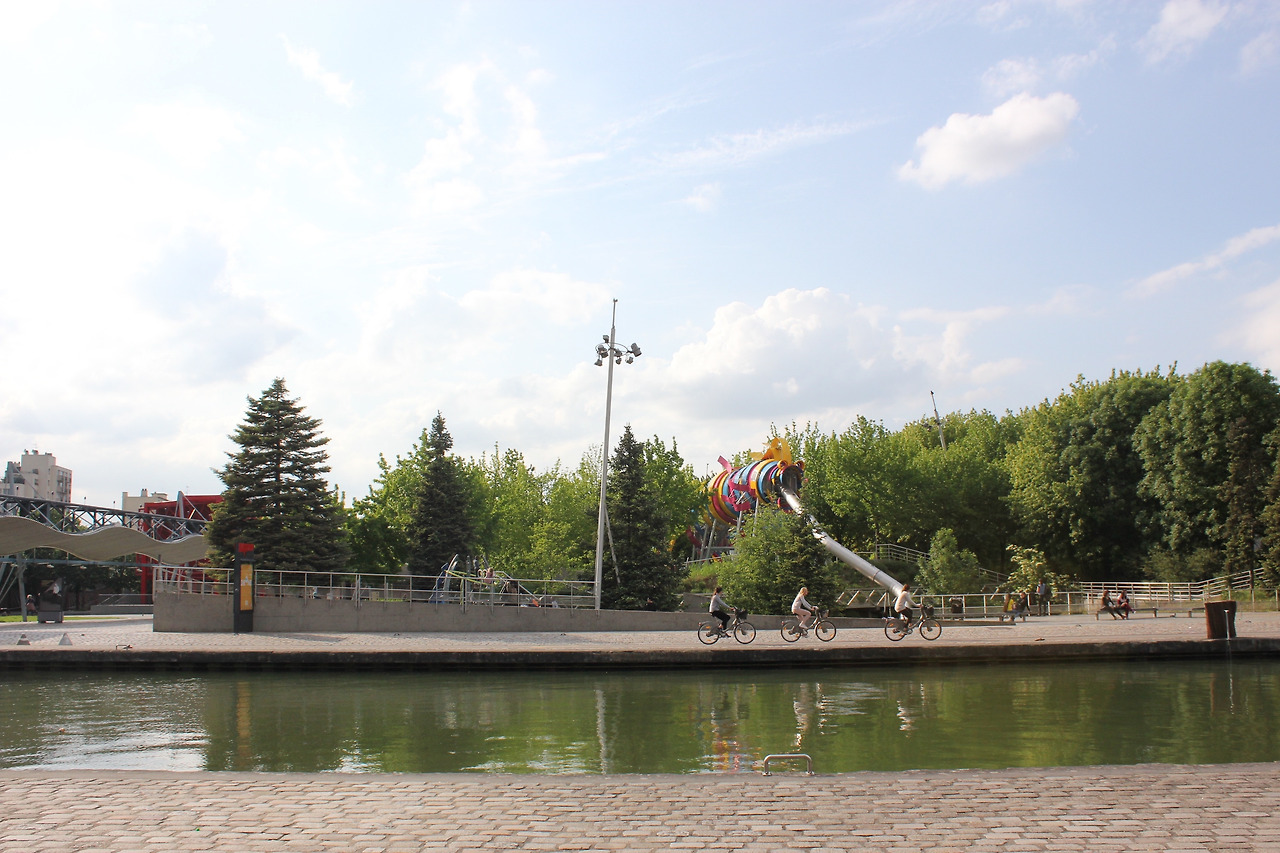 빌레뜨 공원 방문이 처음임에도 불구하고 헤매지 않고 곧잘 길을 찾을 수 있었는데 아마 재능 있는 건축가들의 노력 덕분이 아닐까 하는 생각이 들었다. 하지만 빌레뜨를 북에서 남으로 가로질러 가는데 거의 1시간가량의 시간이 소요되었다. 이는 내 걸음이 느리기 때문이기도 하지만, 걷는 내내 사방에서 볼거리가 가득해 발길을 자주 멈춘 탓도 있을 것이다. 조금 걷다 보면 나타나는 공원에서 한참 자연을 만끽하고, 또 조금 후에 나오는 재미있는 구조물들에 눈을 떼지 못하고, 다리 위를 건너며 산책하는 사람들을 구경하다 보니 발길이 멈출 수밖에 없었다. 아니나 다를 것이 빌레뜨에는 12개의 공원, 26개의 폴리라 불리는 작은 건축물이 있다고 한다. 여기서 폴리라는 것이 재미있는데 정자보다는 제법 건물의 형태를 갖추었지만 그렇다고 하나의 건물이라 말하기에는 또 그 규모가 너무 작은 애매한 건축물이었다. 휴게소나 공원에서 보는 간이 건물이라고 보면 좋을 것 같다. 베르나르 추미가 처음 빌레뜨를 기획할 때 점의 요소를 위해 사용한 것이 바로 이 빨간 폴리들이라고 한다. 공원 사방에 퍼져있는 폴리는 전부 새빨간 색으로 칠해져 있어 초록빛 정원 사이에서 하나의 점으로서 미적인 역할을 톡톡히 해내고 있었다. 그리고 알록달록한 용 구조물이 익살스럽게 놓여있는 용의 공원, 물결 모양으로 굽이치는 바닥에 바람개비들이 세워져 있는 바람과 사구의 공원 등 각각 재치 있는 테마로 이루어진 공원은 보는 이를 즐겁게 했다. 이 외에도 빌레뜨 공원에는 각각 다양한 목적으로 사용되고 있는 스무 여개의 건물들이 있어 많은 파리 시민들이 찾아왔다.