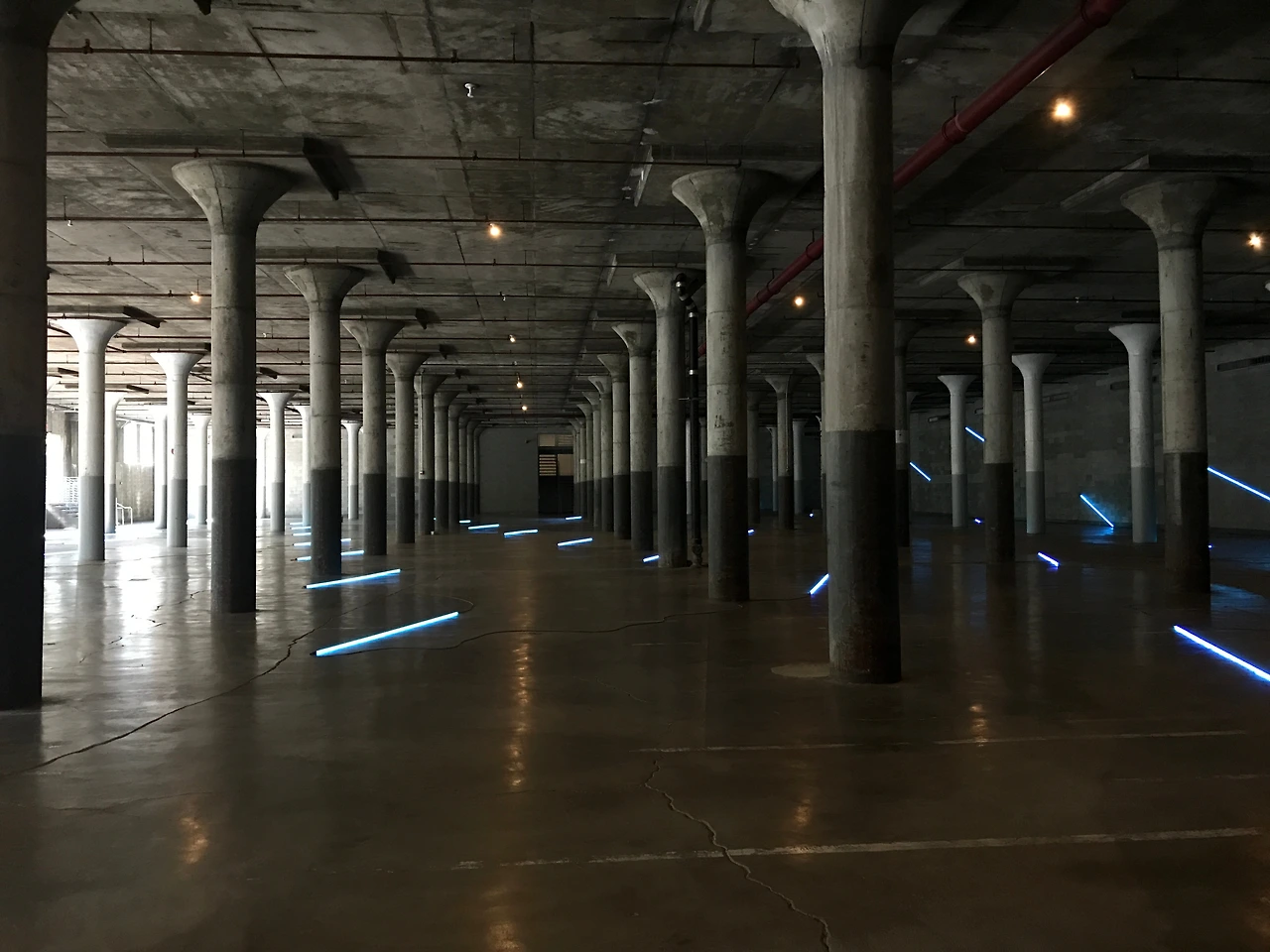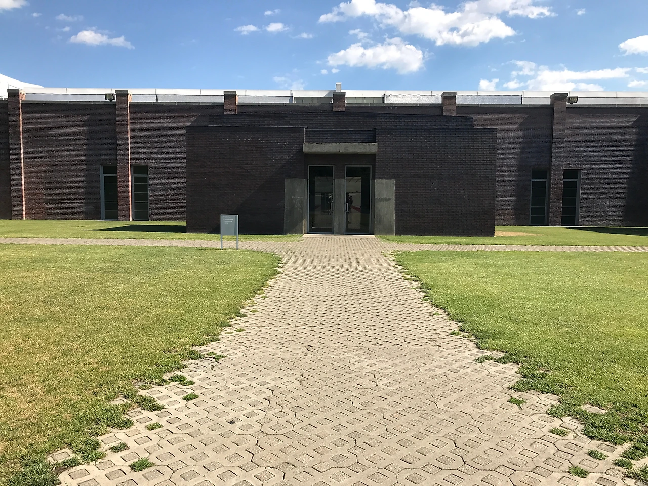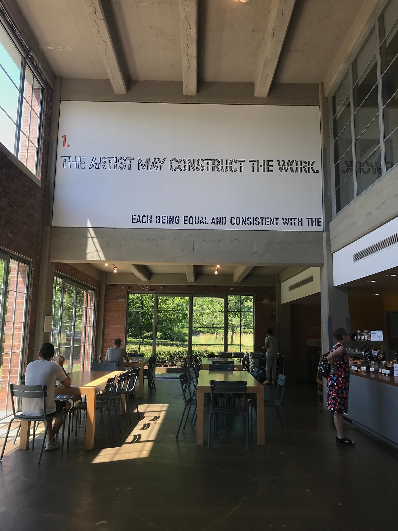 허허벌판과 같은 풍경 속에 다행스레 미술관을 가리키는 표지판이 놓여 있어 쉽게 길을 찾을 수 있었다. 5분 정도 걷다 보니 갈림길 한 편에 가지런히 놓인 ‘디아 : 비컨’이라는 글자가 눈에 띄었다. 길을 꺾어 들어가 푸른 나무를 듬성듬성 심어놓은 주차장을 지나니 검은 벽돌의 낮은 건물이 나타났다. 그 왼편으로 이어진 길의 끝에는 사람 키를 훌쩍 넘는 관목 뒤로 붉은 벽돌의 건물이 놓여 있었다. 첫 번째 건물은 매우 조용했기에 길을 따라 관목 사이로 들어갔다. 관목과 건물 사이의 아늑한 공간에는 정사각형의 철제 테이블이 여럿 놓여 있었고, 환히 개방된 유리창을 통해 건물 내부의 매표소와 레스토랑이 보였다. 매표소에 물으니 기차역에서 구매한 입장권을 동그란 철제 배지와 교환해주며 처음 마주한 건물이 전시장의 입구라고 알려주었다.