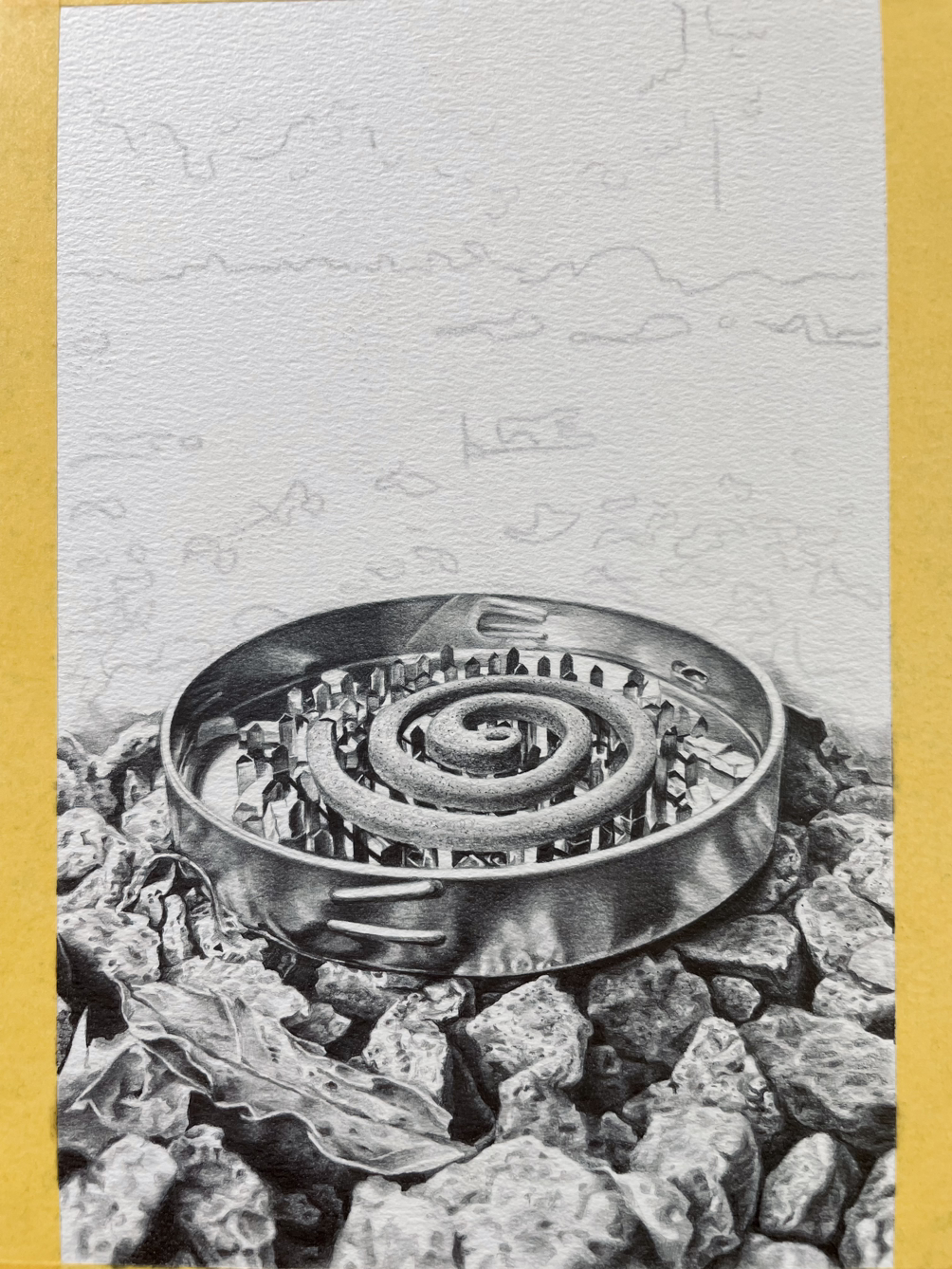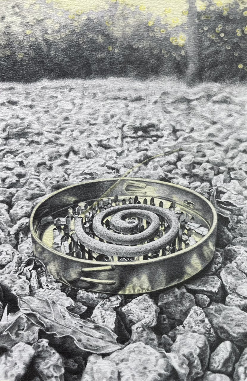 제 몸을 태워 모기를 쫓는 캠핑장의 모기향에서 인생의 가을을 앞둔 나를 본다. 곧고 길게 뻗은 모양이 아닌 빙글빙글 회전하는 모기향의 생김을 보며 우리의 인생을 느낀다. 평생을 한 방향으로만 전진할 수 없는 인생은 결국 ‘나’라는 축을 중심으로 방향을 바꾸며 돌고 돌아가는 것이다. 희미하게 피어오르는 모기향을 바라보며, 새로운 계절을 맞이할 내 인생의 여름과 가을 사이를 태워본다.