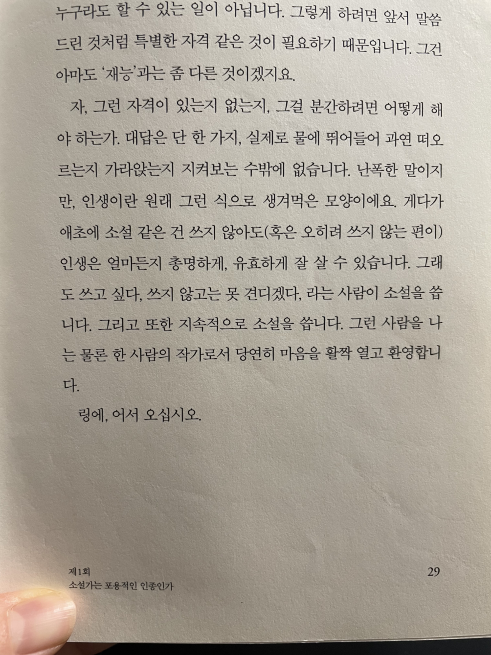 뛰어난 소설도, 그다지 뛰어나지 않은 소설도, 혹은 별 볼일 없는 소설도 (전혀) 괜찮아요, 아무튼 닥치는 대로 읽을 것. 조금이라도 많은 이야기에 내 몸을 통과시킬 것. 수많은 뛰어난 문장을 만날 것. 때로는 뛰어나지 않은 문장을 만날 것. 그것이 가장 중요한 작업입니다.