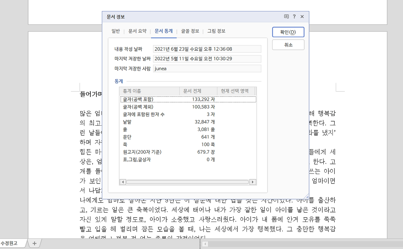 한글 프로그램을 사용하고 있다면 (파일-문서정보-문서통계)에서 본인의 글이 원고지로 양이 어느 정도 인지 확인 할 수 있어요.