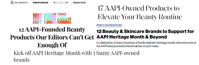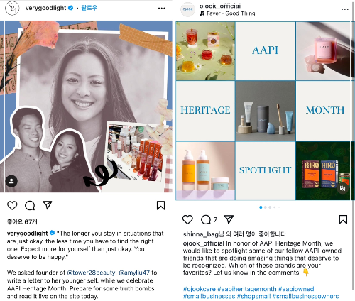 재밌는건 미국엔 다양한 인종이 함께 살아가는 국가이다보니, 각 인종별로 이를 기념하고 존중하는 의미로 매달 "heritage month" 가 있다. 그리고 한국을 포함한 '아시안 (Asians)' 을 기념하는 'Asian American Heriatge Month (AAPI)' 는 매년 5월이다. 이때는 미디어에서도 아시안 파운더의 브랜드를 하이라이트한다거나, 파운더들이 협업해 함께 프로모션을 하거나, 번들상품을 기획해 판매하기도 한다.
