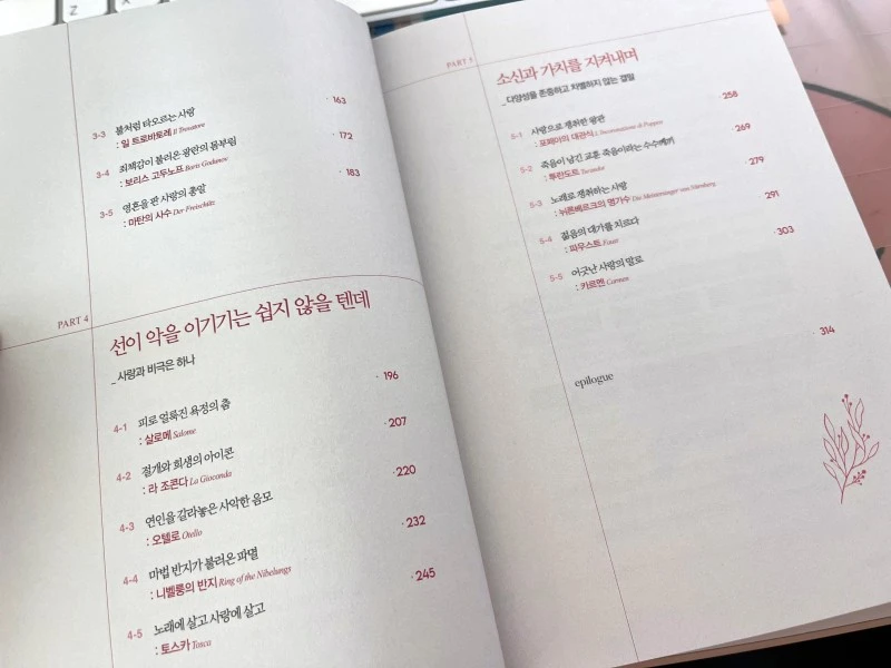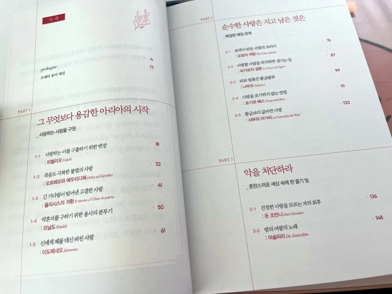 책의 차례를 살펴보면 책을 집필하게 된 계기와 어떻게 책이 읽히길 바라는지에 대한 내용을 담은 '프롤로그'와 오페라를 잘 즐길 수 있는 배경지식이 될 '오페라 용어 해설' 그리고 25편의 오페라를 5개의 파트로 나누었고, 마지막 '에필로그'로 구성되어 있다.