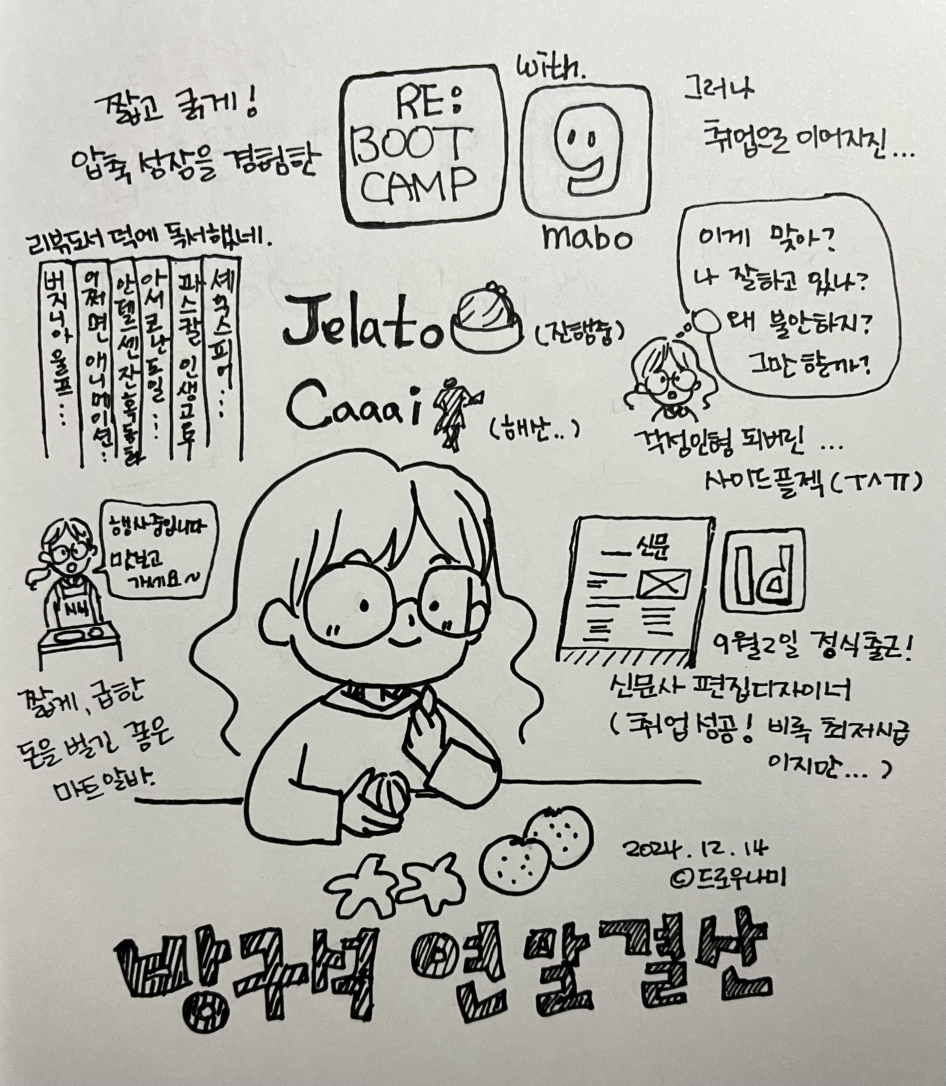 3개월 동안 리부트 캠프의 파트너사 '마보'에서 활동하며 난생처음 기사글을 써보고, 인스타툰을 그리기도 했다.(2편이라 아쉬웠지만-) 짧은 기간에 압축 성장을 경험해서 뿌듯하고 좋은 사람들을 곁에 두게 되어 꽤 괜찮은 프로젝트 참여였다. 아쉽게 취업으로 이어지진 못했지만 사이드 프로젝트 제안을 받게 됐다.