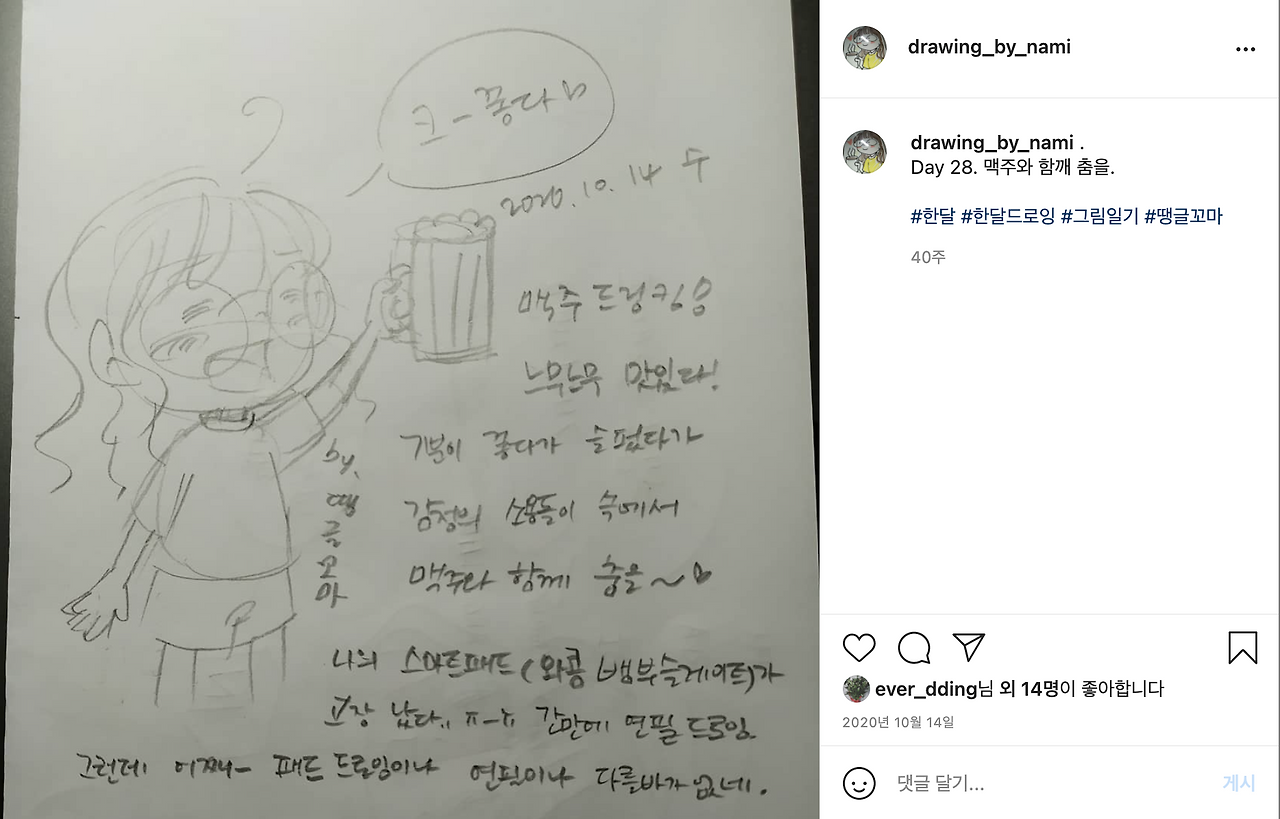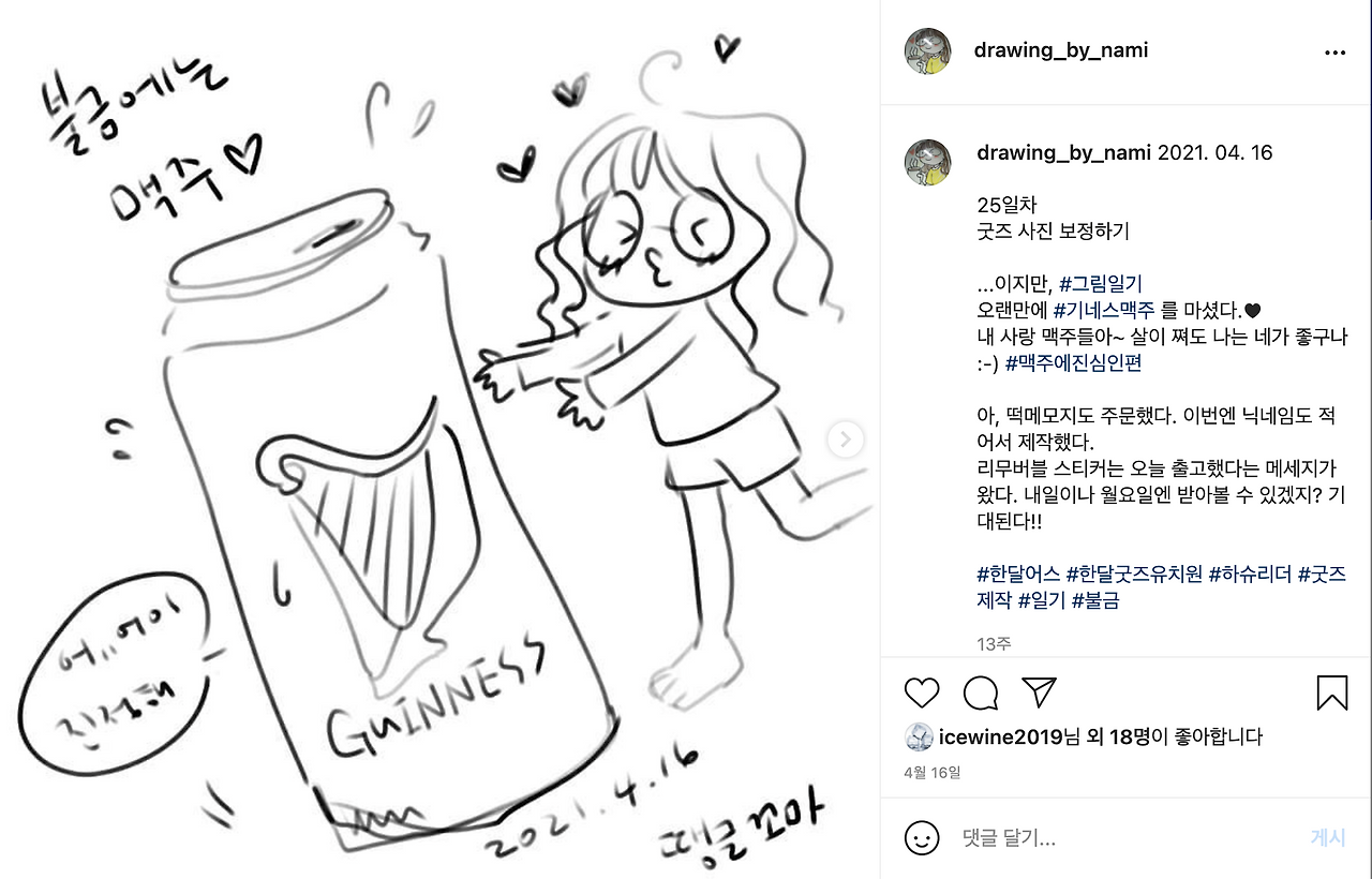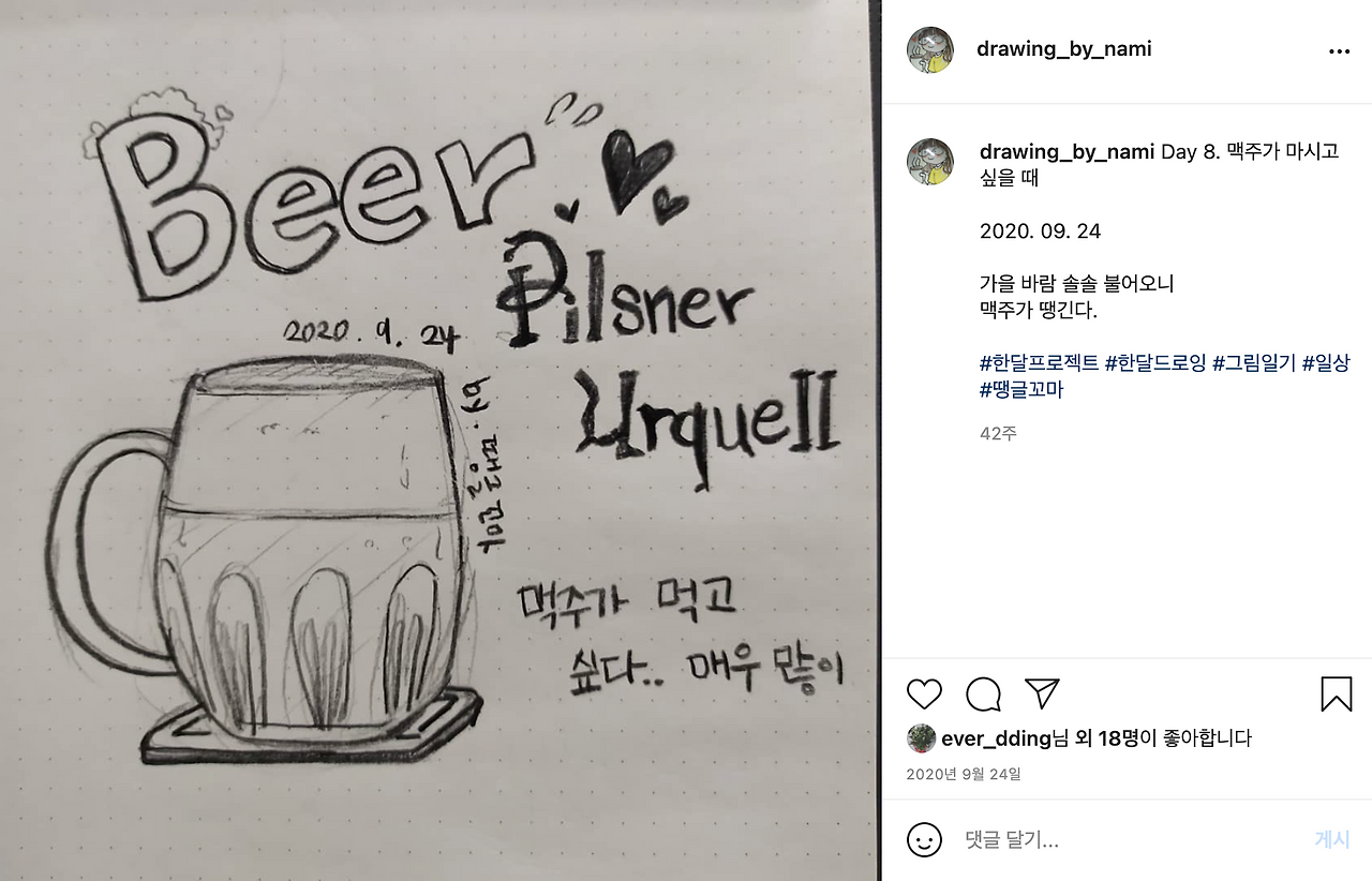 저의 맥주에 대한 진심은 그림에서도 나타납니다. 맥주를 마시고 싶어서 맥주를 마시면서도 맥주를 그리고 표현하고 있지요. 사진으로 남기는 것은 물론이고요. (저의 그림이 더 보고 싶으시다면 인스타로 놀러 오세요.)
