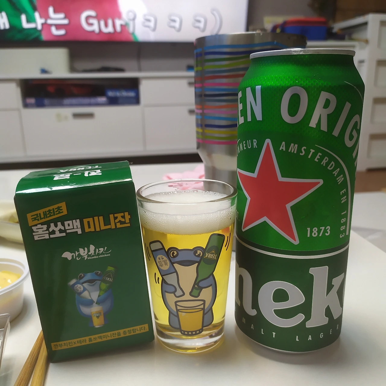 쌉싸름한 목 넘김, 마시고 난 후의 묵직함 그리고 입안에 맴도는 여운까지 제가 원하는 맥주의 맛을 모두 망라하고 있는 것이 바로 '하이네켄'입니다. 깐부치킨 먹던 날 행사 이벤트로 딸려온 미니 쏘맥잔에 따르니 마치 소맥을 만들어 둔 것 같은 색깔이네요. 히히-