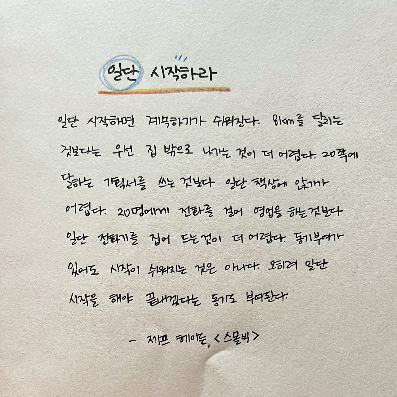‘시작이 반이다’라는 속담이 떠오르는 명언이다. 나는 늘 뭐든 저지르고 보는 스타일이라 끝맺음을 제대로 하지 못하는 것이 늘 아쉬웠다. 그런데 오늘 이 문장을 보니 이 또한 나의 재능이란 생각이 든다. 일단 시작을 해야 끝을 내야겠다는 동기부여가 된다니. 그렇구나, 나는 늘 이렇게 성장했다. 회사에서도 일단 하면 잘하면서 왜 그러냐는 소리도 곧잘 들었다. 그런데 나는 엄살을 부리는 게 아니었다. 잘하고 싶은데 잘할 자신이 없어서 그랬다. 정말 제대로 하고 있는지 알지 못해서 그랬다. 나를 위한 일이 아니라 회사를 위한 일이라서 실수할까 봐 긴장이 됐다. 진정으로 나를 이끌어 줄 사람이 단 한 명도 없었기에 더 그랬다. 이제 와서 깨닫는다. 그런 상황들이 나의 성격이 지금의 나를 만들어냈다는 것을. 미래의 나도 늘 시작을 하고 수습을 해내느라 피똥을 싸게 될 것이다. 그래도 괜찮다. 앞으로는 뭘 하든 나를 위해서 시작하고 끝을 낼 일들만 할 거니까.