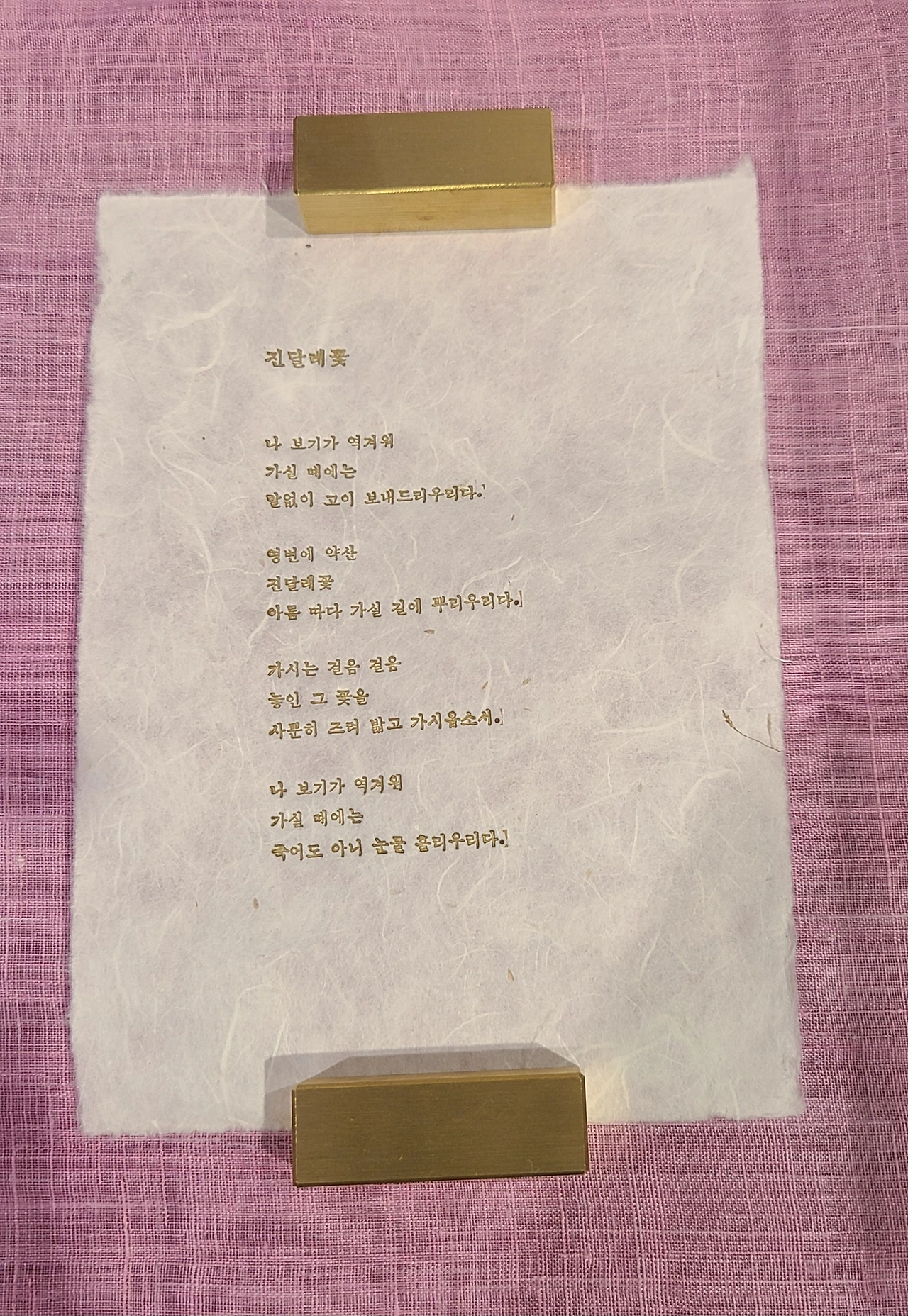 영변에 약산 진달래꽃 아름 따다 님이 가시는 걸음걸음 뿌려 두리니