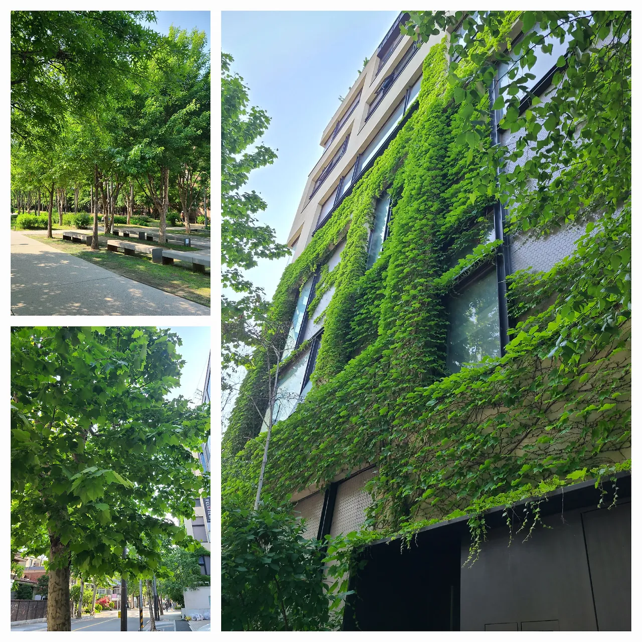 대로변의 한 건물을 초록으로 가득 덮어버린 담쟁이 잎, 경의선 숲길에서 숲을 이룬 나무들, 큰 손바닥 같은 가로수 플라타너스 잎.